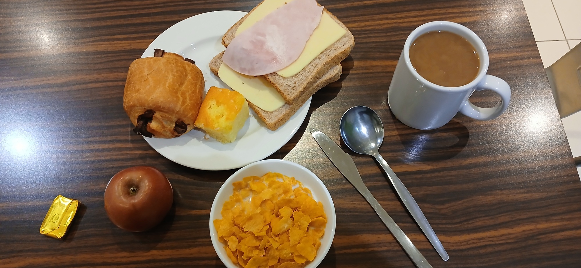 The few other guests and I sat around a table and got stuck into bread, Emmental cheese and ham, bowls of cornflakes and granola. Cake and pastries. Yogurt and fruit. There was reasonable good coffee too.