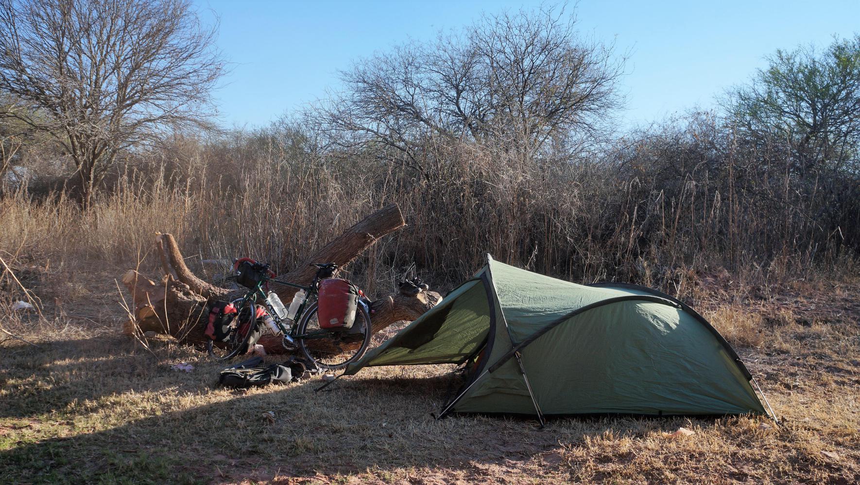 On from Molde I've cycled a few kilometres, passing through the village of La Vina, to the south of which I came to a dry stream with a grassy streambank, and have decided to pitch the tent. I write as the sun hovers just above the horizon. I've already been here two hours where it's been warm enough to sit outside the tent enjoying a sunny early spring late afternoon.