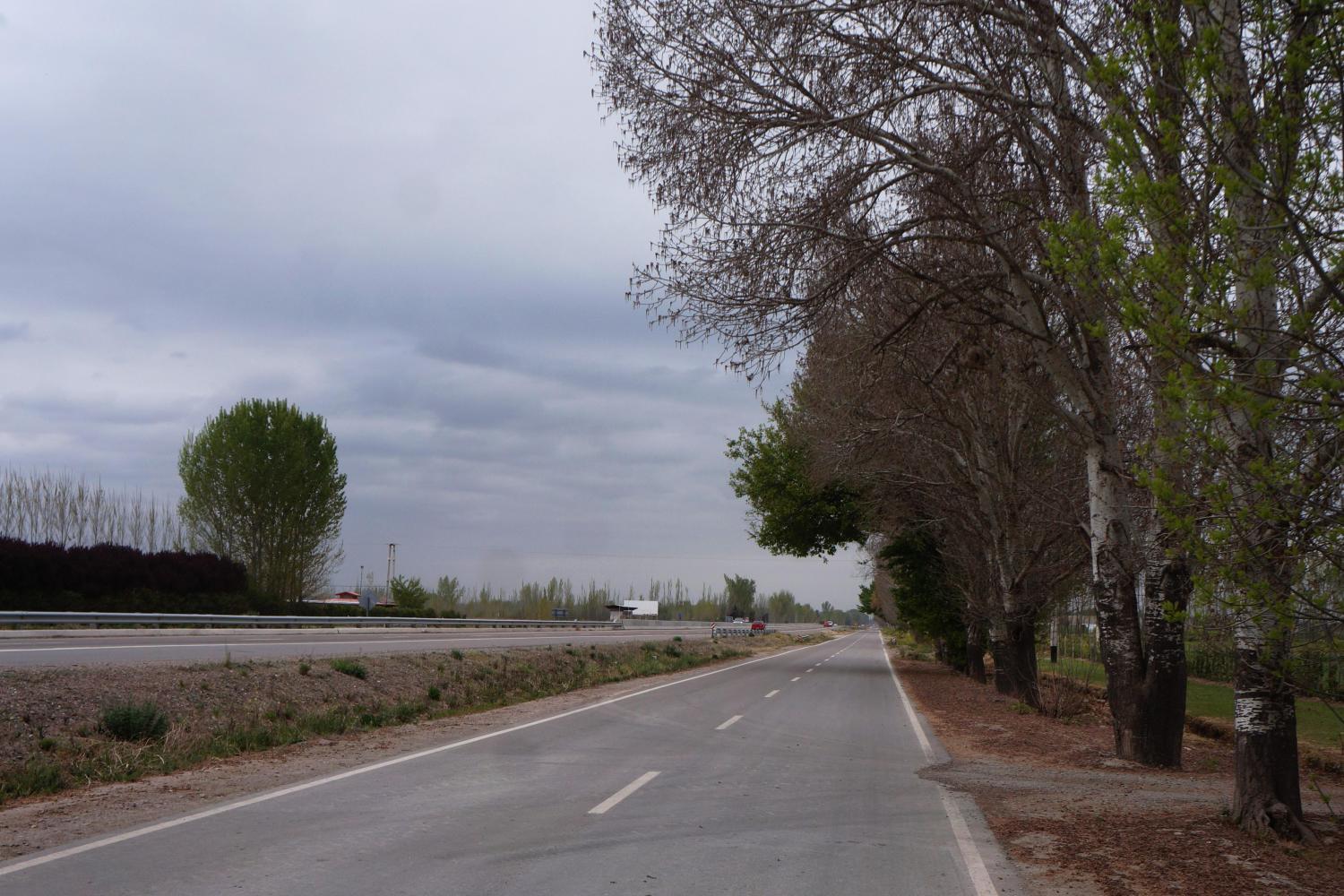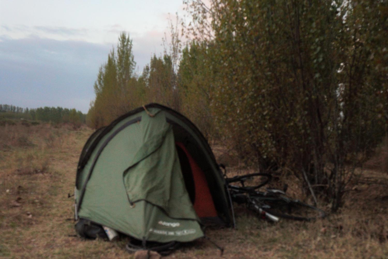 Eventually though I come to an area of open scrubland but with stands of elm trees to shield a tent from view all along the road, where I slide the bike underneath a fence to gain access.