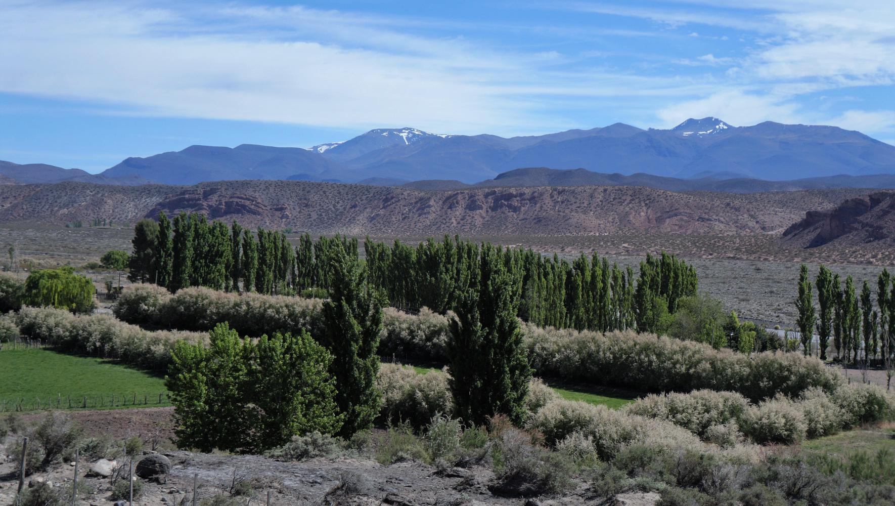 The place called Barrancas across the river is just that, a narrow valley about a kilometre across. A green oasis with meandering river, pasture with elm tree windbreaks enclosing an estancia (farmhouse). There's towering steep brown slopes on the southside, as well as looking back at the Mendoza northside. The Barrancas.