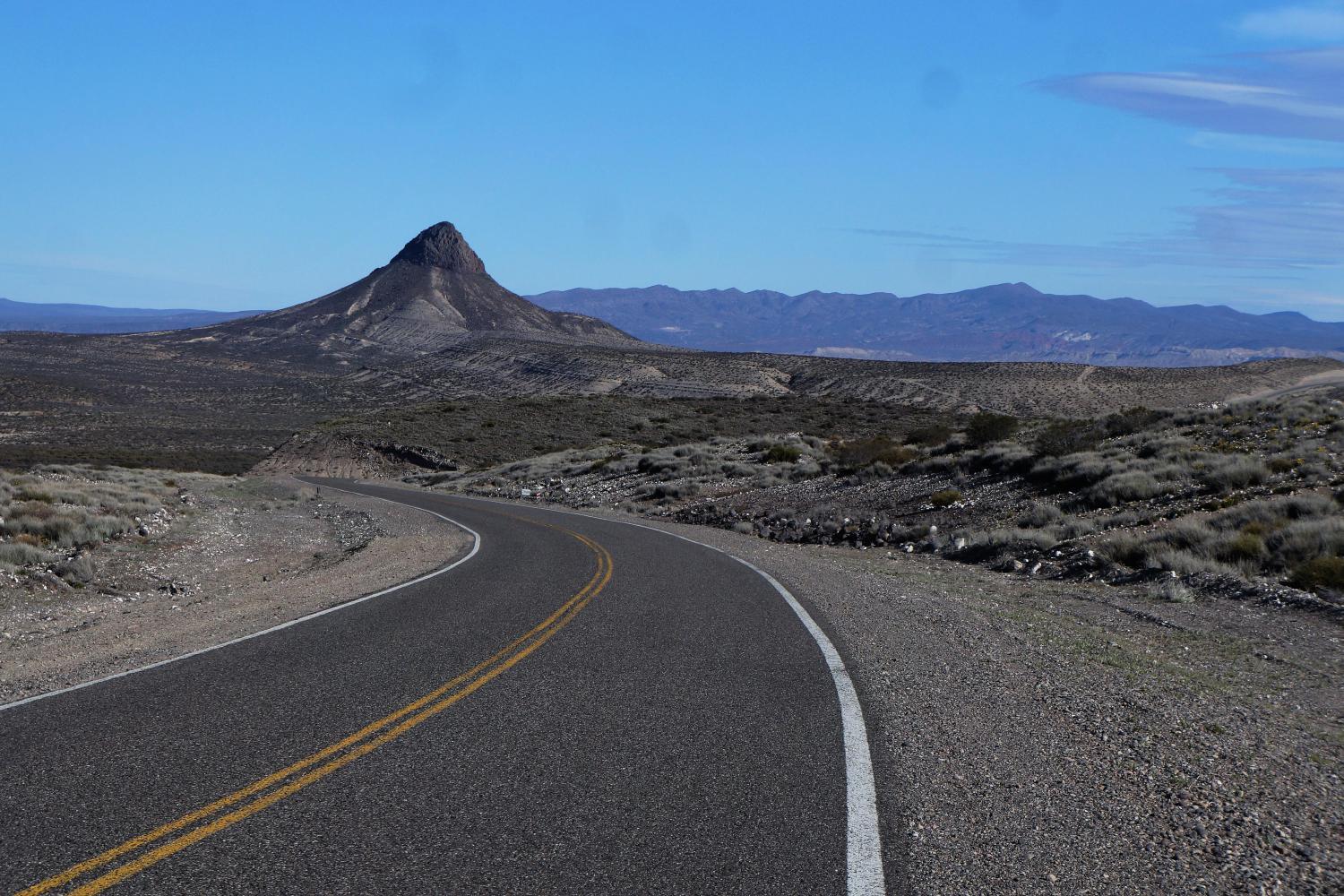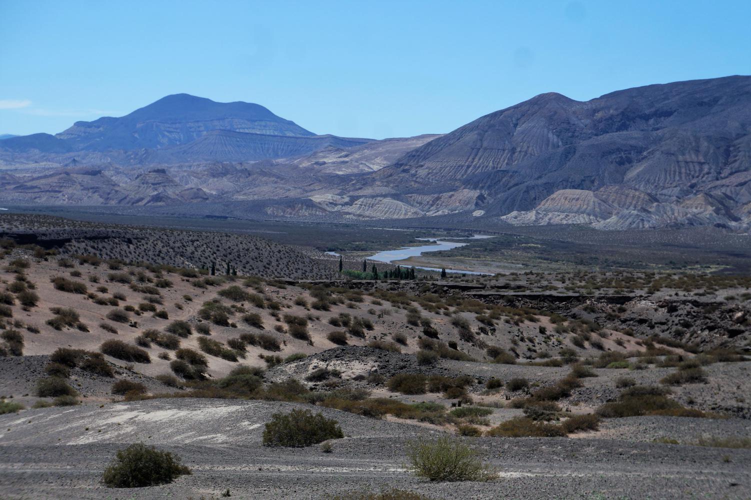 That 35 K on is a climb to begin with, followed by a descent back to the valley, looking to the left at the high barrancas on the Mendoza side. Though eventtual the road swings directly south, up through the barrancas on the southside.