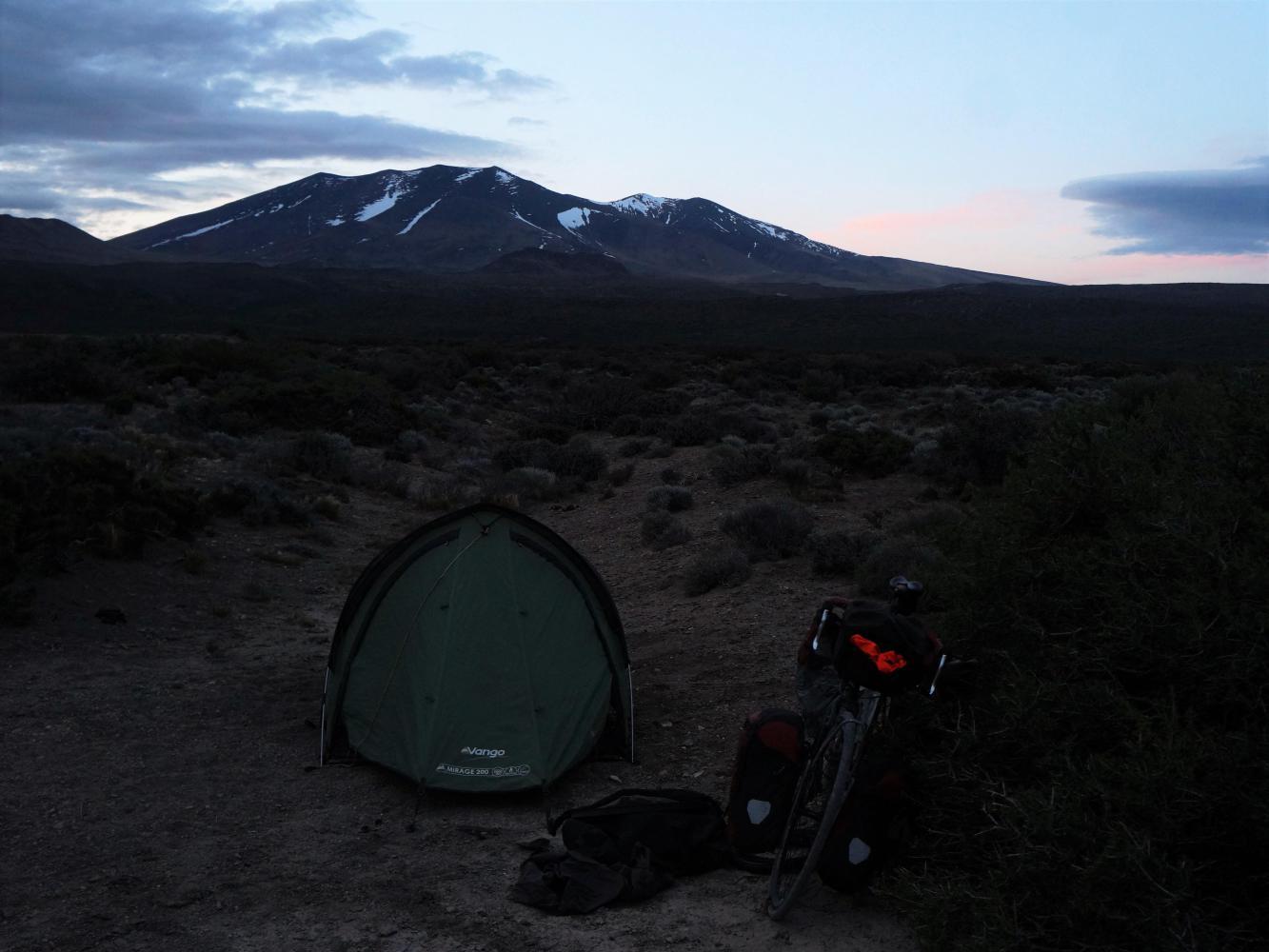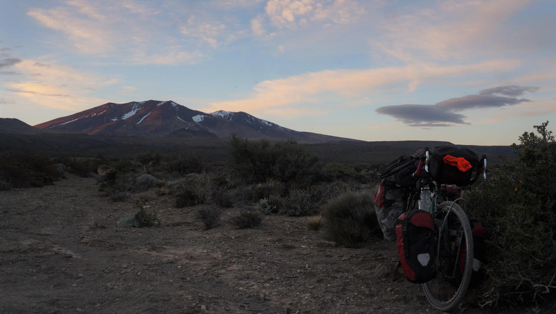 I reach the village about two, lunch in a pine forest playground. Then fill up on water at a builder suppliers before setting off again at four. The aim to take enough out of the ninety kilometres to Chos Malal before sunset, to have an easy day-morning ride tomorrow with afternoon off. What follows is a late afternoon to nightfall ride with magical evening light and ambiances.