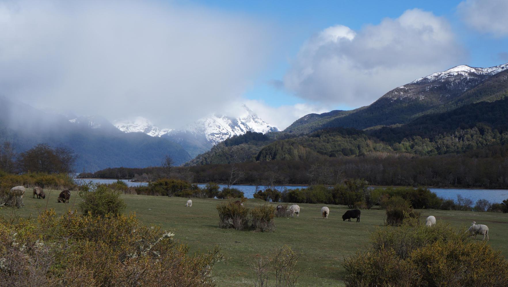 I wheel the bike out of the wood and set off across the lakeside field where, the sheep are this morning, instead of out grazing the roadside. Merino sheep, most have twin or even triplet lambs. They're used to people seemingly, cause they just stand in the track and stare as I cycle right by them. They share the lakeside with many pairs of Bandurrias, those big ibis birds that make a duck-like quack quack as they stomp over the grass.