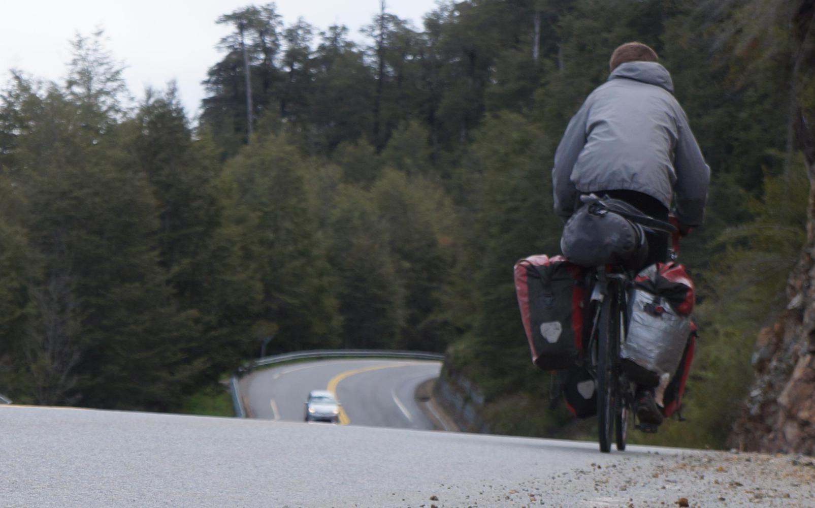 My bike is the guts of a metre wide and, the road, the lane on my side is roughly three and a half metres from road edge to central white line. A car is two metres, a big vehicle such as a van, two and a half...That doesn't leave much space when these big Renault Traffic mini-bus vans pass me with oncoming traffic on the other side. The mini-buses or excursion tour-buses have been out early this morning and have ferried tourist around all day. But now the driver just wants to get home to Bariloche as quick as humanly possible, cause it's early up in the morning and the same routine again tomorrow. On bends, they cut a straight line as not to ease off the pedal... It doesn't matter that I'm entering the same bend, they brush tight pass my left side pannier, then are out over the middle white line 20-30 metres on in the apex of the bend.