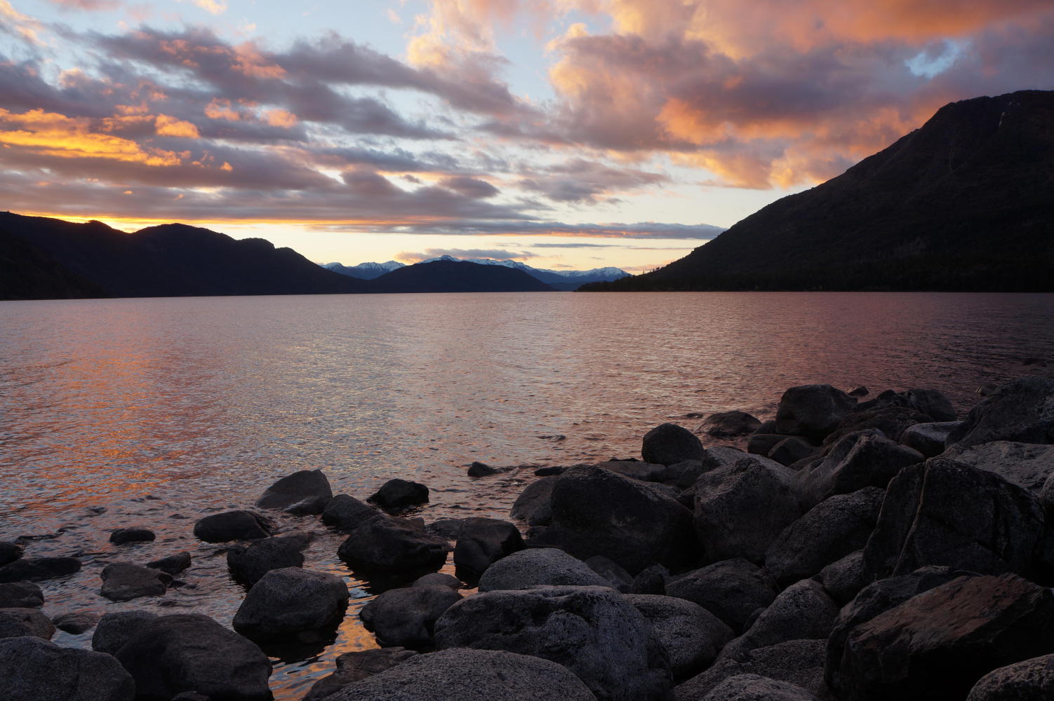 A car pulls to a halt in the trees behind me. A man gets out and a woman is getting out as he strides on ahead down the shore with a point and shot camera, or it might've been a phone, reaching out at arm's length to meet the view, the lake with snow-capped mountains beyond. His attention trained on the back of the camera as his feet crunch until pausing a few metres short of the water's edge. Click. By now his partner has caught up with him. They chatter as she poses for a picture. No sooner than that is taken than he hands the camera to her and runs excitedly to the water's edge, crouches down and puts his hand in the water while looking to the camera. Click. They both then run quickly back to the car, get in, slam the doors and drive off.