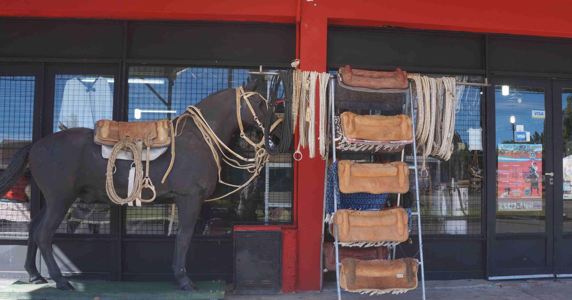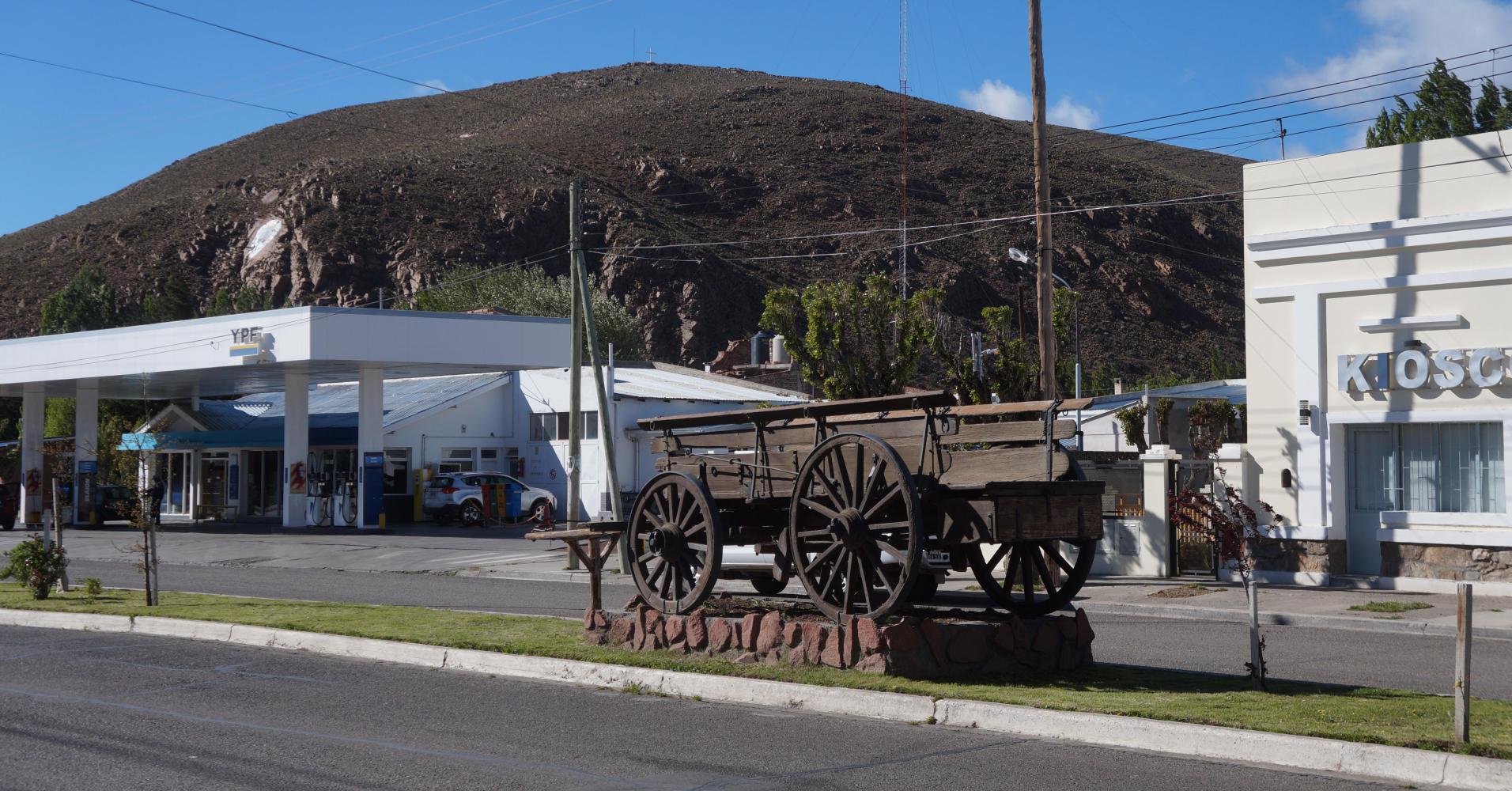 Gobernador Costa: a timeless frontier town, service centre, cowboy town. Many of It's houses are boarded up, such as the two next the bus shelter where I pull in to sort out my gear problem. I find I've both types of cable, gear and brake. A little further along the street, there's a panaderia where I buy bread and a big bag of fracturas. Then at the petrol station fill up on water before heading south out of town.
