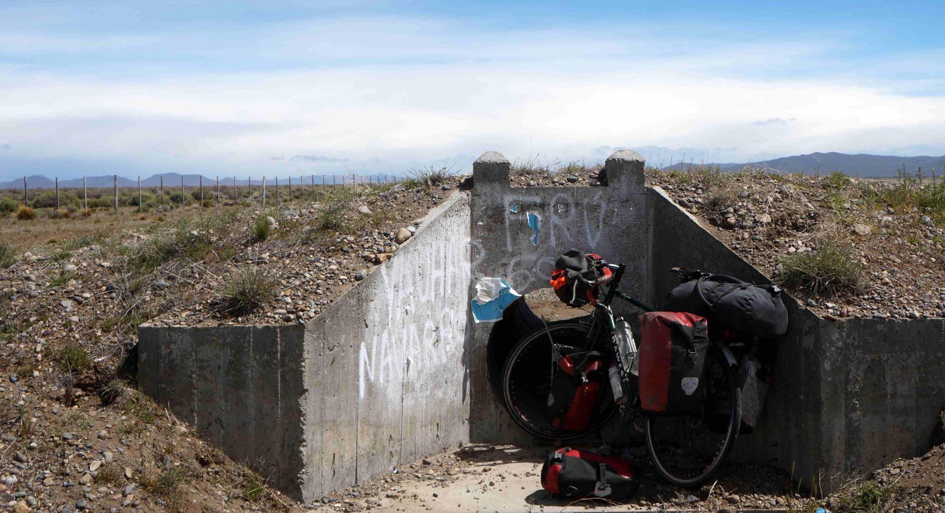 The wind gets gradually stronger during the morning, but I'm determent to keep riding as long as possible, not to be cheated of my destination-gold for the day. There is now more lush pasture either side, irrigated by a network of water-channels, from which, I fill two litres of water for cooking. And the only shelter there is when it comes time to stop for lunch, is a culvert.