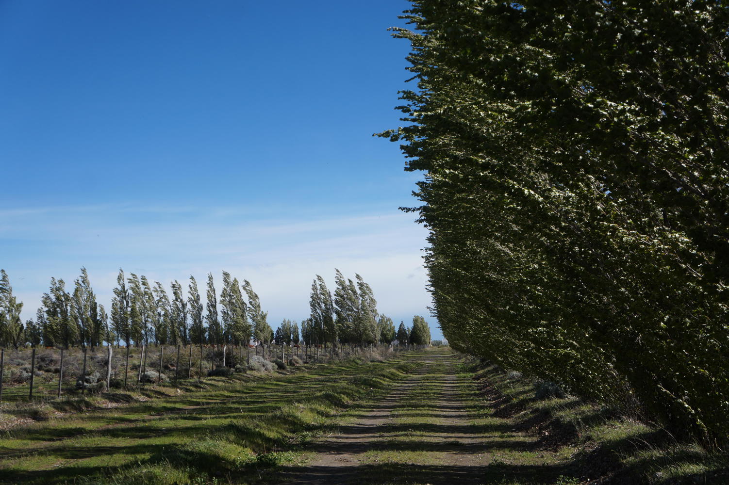 None the less, the wind becomes a dangerous crosswind on this 7km section. From the junction, I try riding, but It's impossible. Even continuing to push, the wind forces me from right to left over the road, pushing me on over the shoulder and down a bank to a fence following the road. Thereupon, it is a precarious push forward, toward an elm tree windbreak on the edge of town.