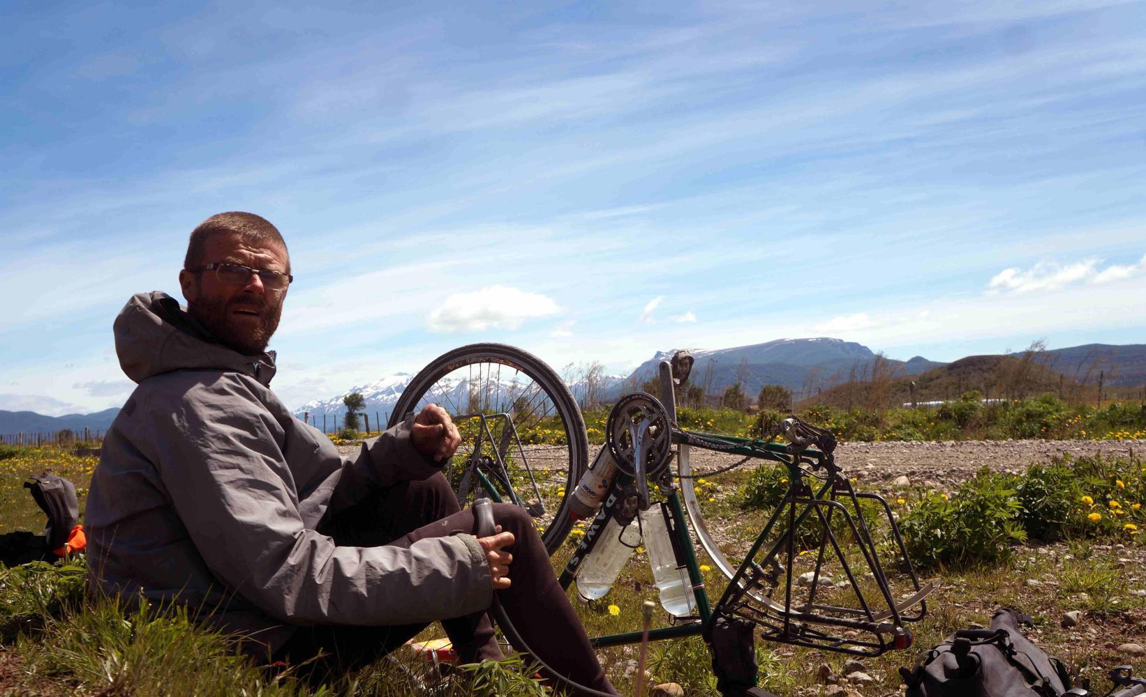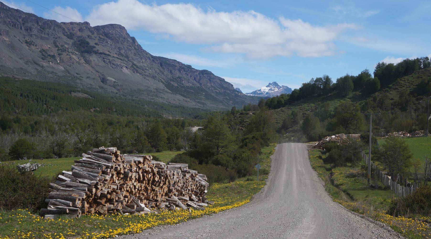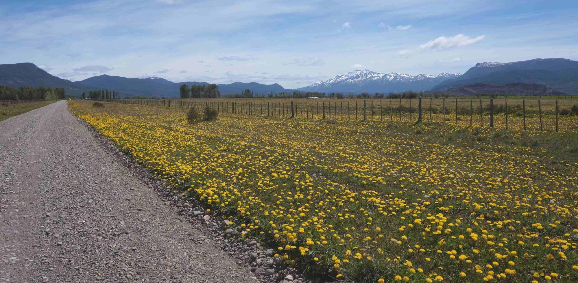 I decide to turn right, as straight on to Coyhaique Alto, alto meaning high implies climbing up again, and I want to avoid that. As expect the right continues downhill and soon I'm trundling along a wide valley of ever more luxuriant dandelion speckled pasture. On toward the village of Nirebuo, with dark wooded hills of the cordillera and snow streaked mountains just beyond. About here, after having stopped to take photos, the moment I take the bike to go on, the rear-tyre is flat, again.