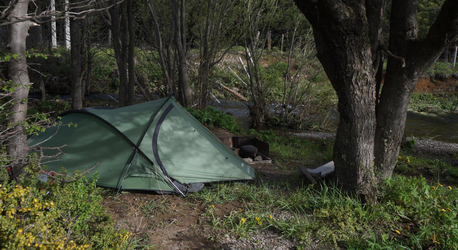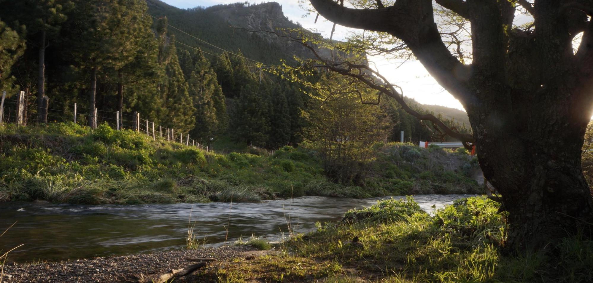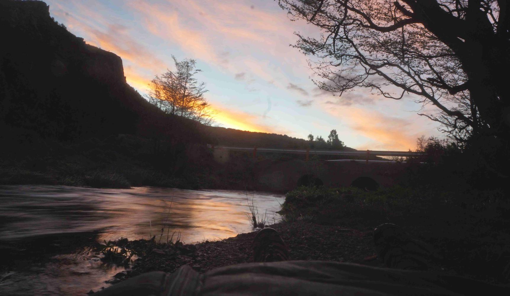 The enduring feature here, the primeval forest of native beech much disfigured by forest clearing and the ever presences of fenced in private property. Even rivers and streams are well fenced in. So finding a place to camp isn't easy. Not until the road descends into a ravine with trees down to the road and no houses anywhere near: the road bottoming out to a river with a bridge over and on, a track off to the left on the approach, down to the riverbank with the blacked ashes of a fire from previous overnighting, is there the possibility of camping. In actual fact, its a good place, concealed by a canopy of trees and by the fire pit is smooth and level for the tent. There's also the ambiance of the stream.