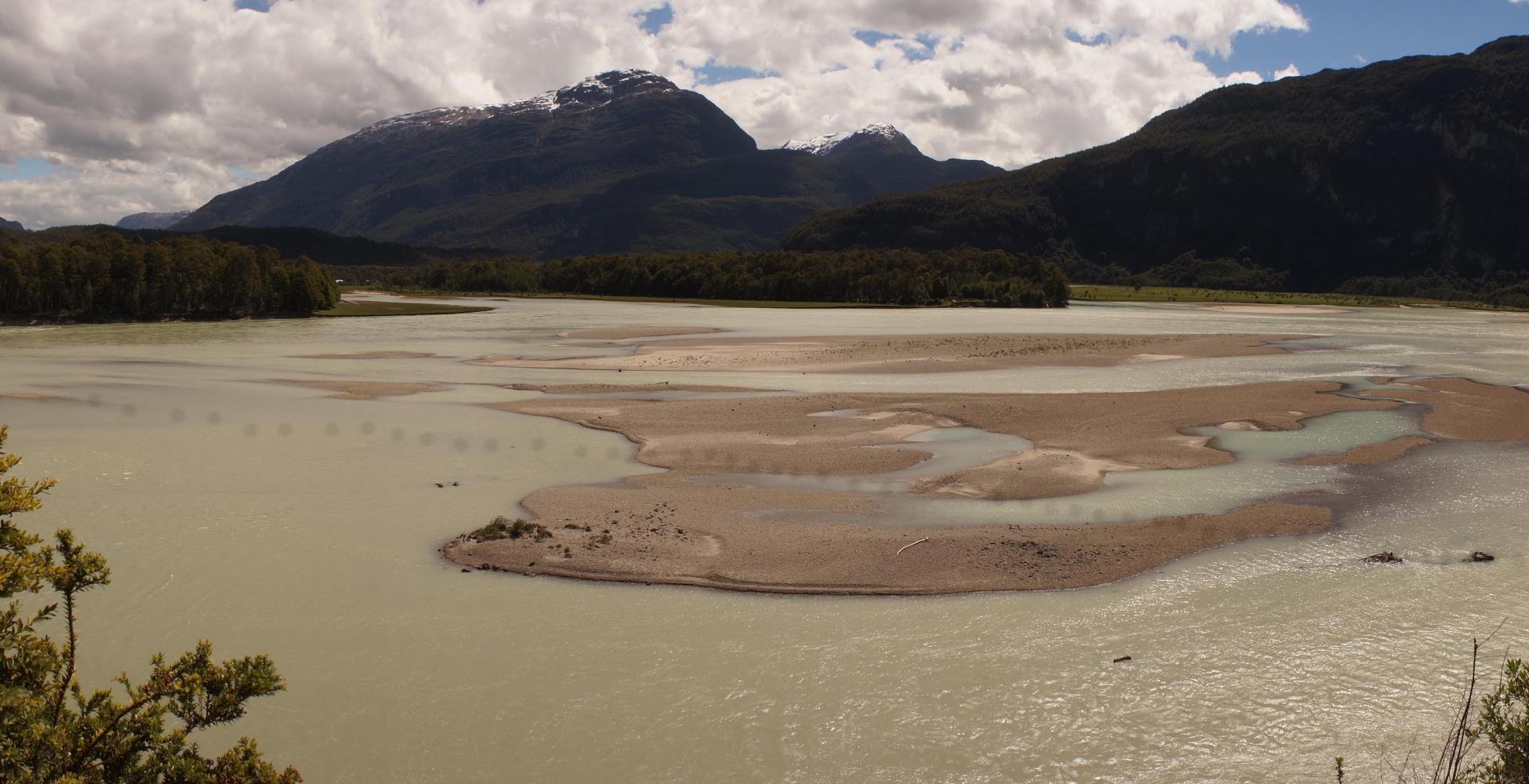 I take the tent down shortly before nine and then push the loaded up bike back up to the road not long after. The road on is a smooth consolidated gravel, like a good farm track, through groves of alerces trees that keep it in shade and cool. And it would remain much the same for the duration of the day, with only one short climb to spoil the apple cart. The way following a narrow river valley, then out alongside the biggest river in the region, Rio Baker.