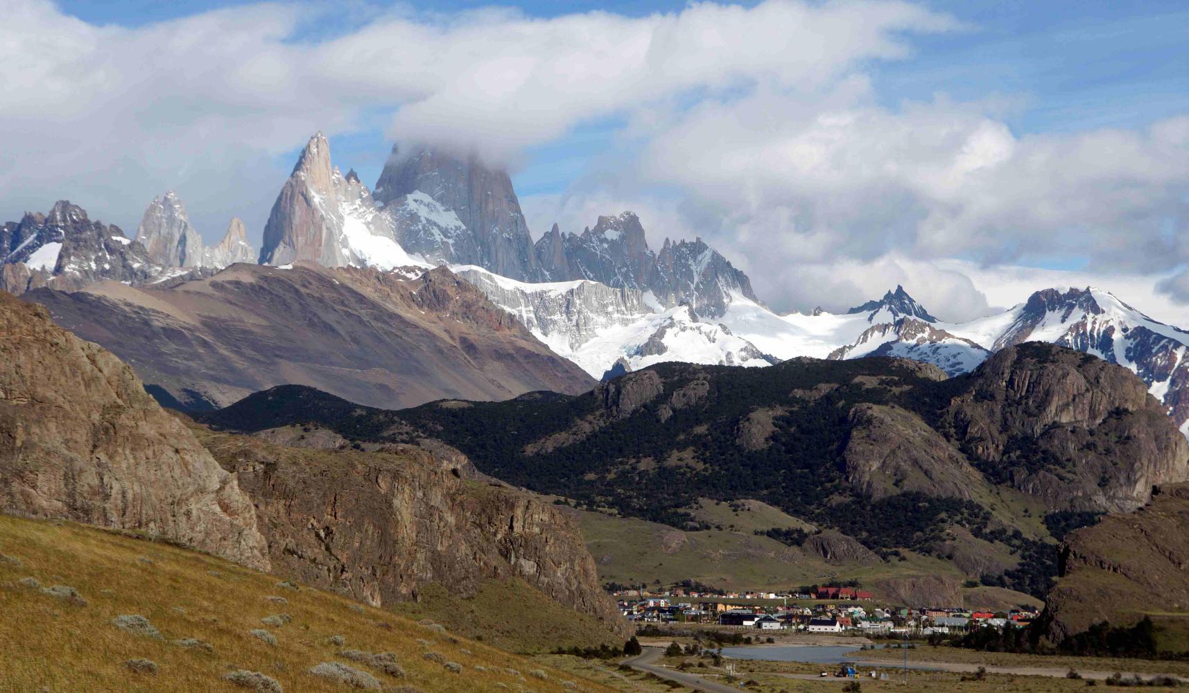 The weather after yesterday's wind and rain is sunny and quite calm; just a breezy tailwind. Though I meet cyclists coming in the other direction who didn't find it so calm. It was ideal for cycling and comfortable to be out in the glorious day it turned out to be leaving Chalten. About ten K out I stop and take one last look back, with a clear sky view of Fitzroy's steeple rocks with a curl of misty cloud rising from it's west side.