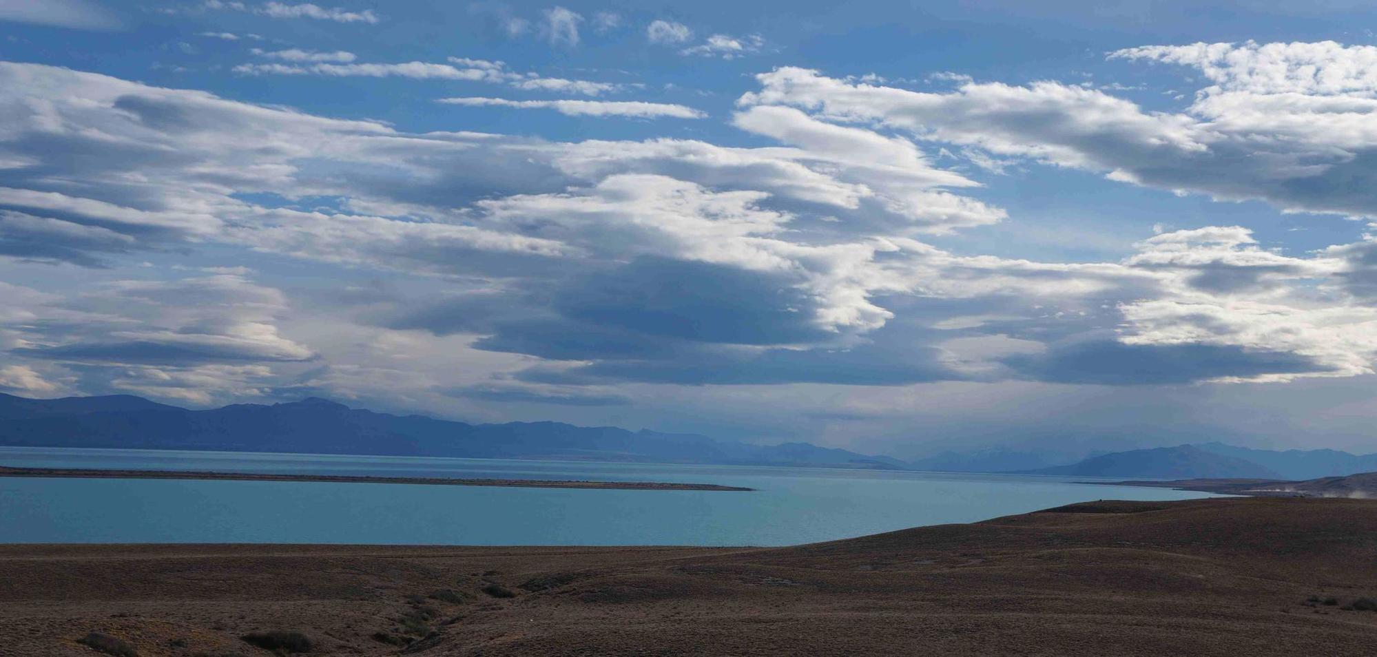 The landscape has much changed from the temperate rainforest of the Caratera Austral I was on over a week ago. Here it is open and treeless, except for the planted tall elm tree windbreaks at estancias. The general colour is light brown with barren barrancas off to the left. The road traversing undulating plain which stretches to the horizon ahead and to my right. But before long the turquoise sheet of water of Lago Viedema opens up to the right. Like precious green liquid spilt on a yellowish brown landscape.