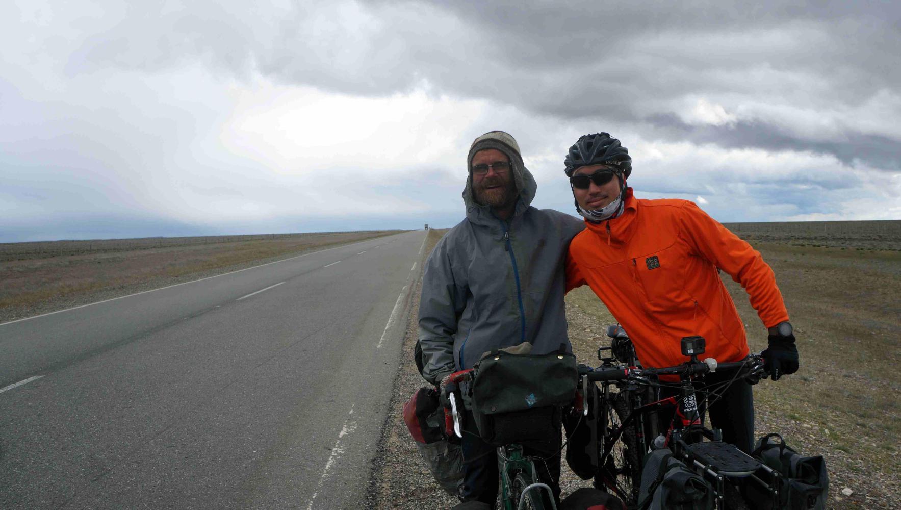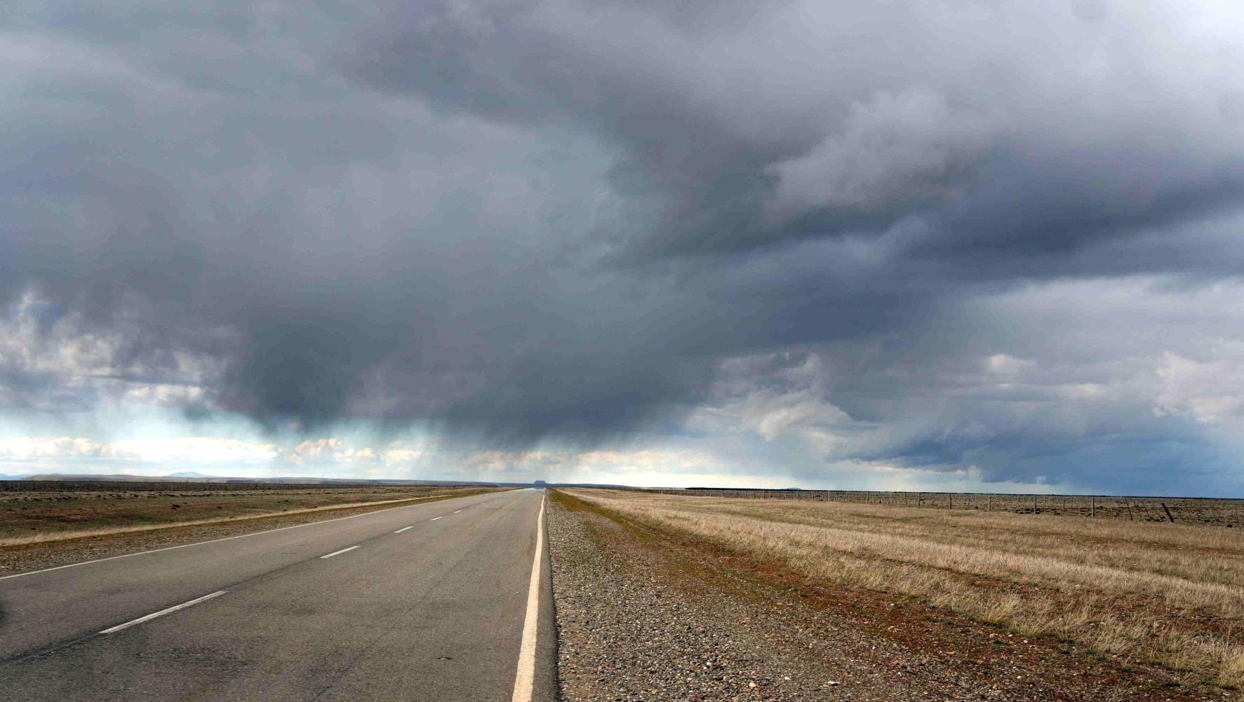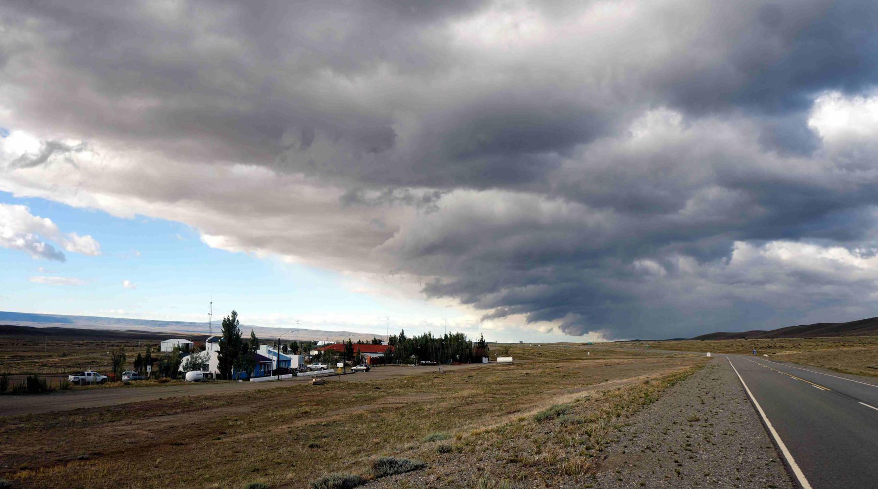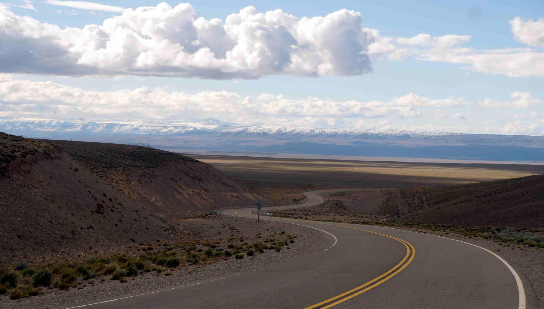Half nine: the wind is starting to rise as ahead to the west, the hills are white with snow after yesterday's percipitation. But, not much further the road does a great curve to the right, turning headwind to tailwind. Beyond the curve, Route 37 for the Perito Moreno national park splits off west. I had planned turning here for the park, but I would've been riding directly into the wind; and, do I really want to ride 90km on little small stones, tripping underneath my wheels. Given that the weather is looking so bleak, with snow on the hills to the west.
