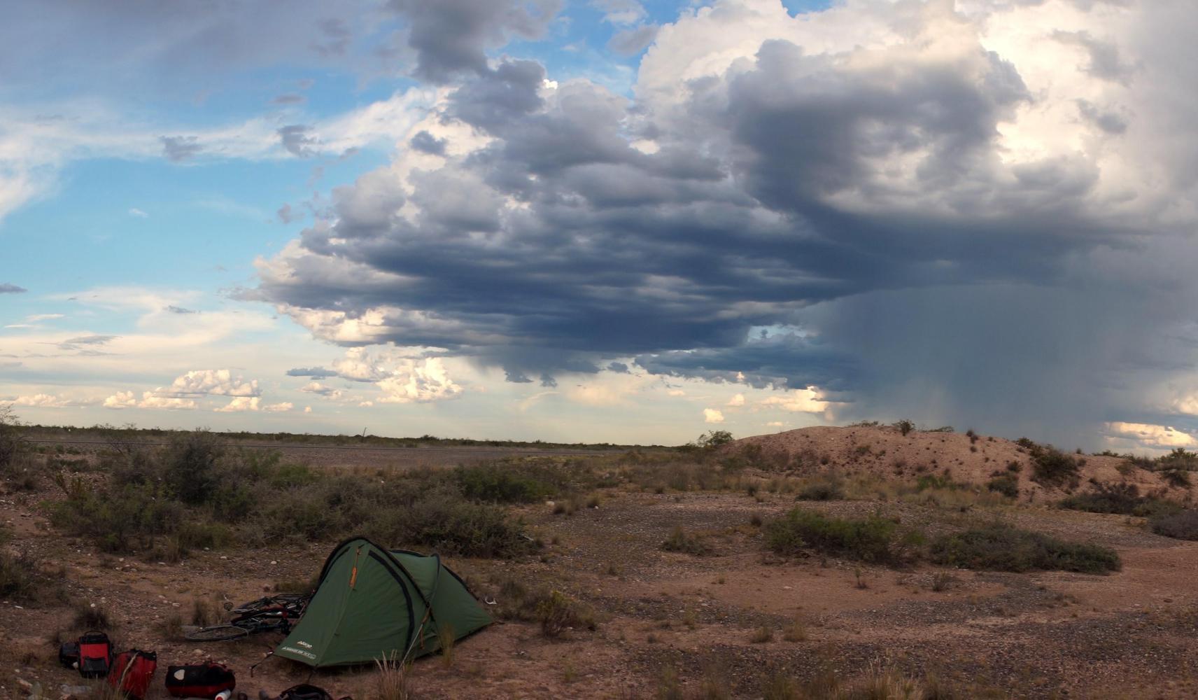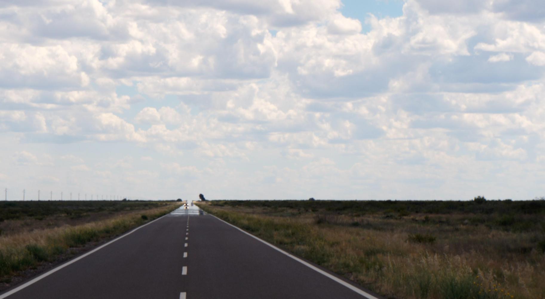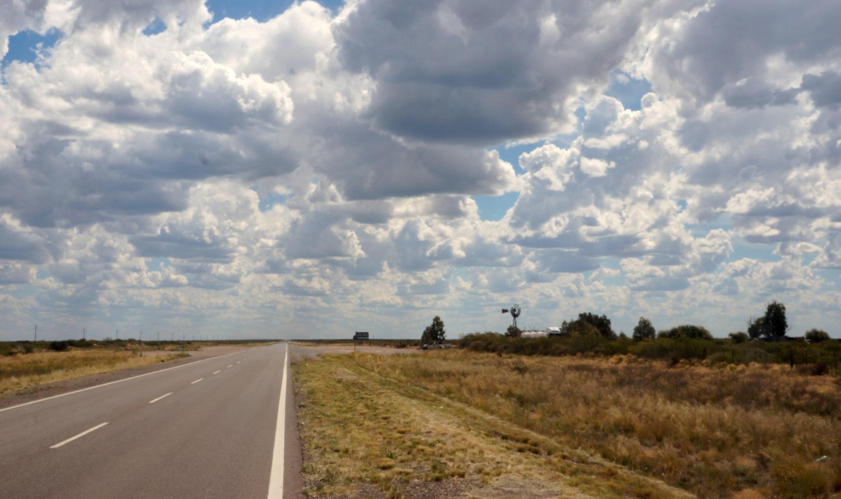 Leaving Rio Colorado, with the main village off to the side, it is a hundred and forty kilometres to the next place, Choele Choel, and a day of looking ahead along a dead straight road at an unchanging horizon where the road blends into the sky. To the side the same green thorn desert off as far as the eye can see. I pass two farm houses the whole day with a windmill for pumping water up from a borehole.