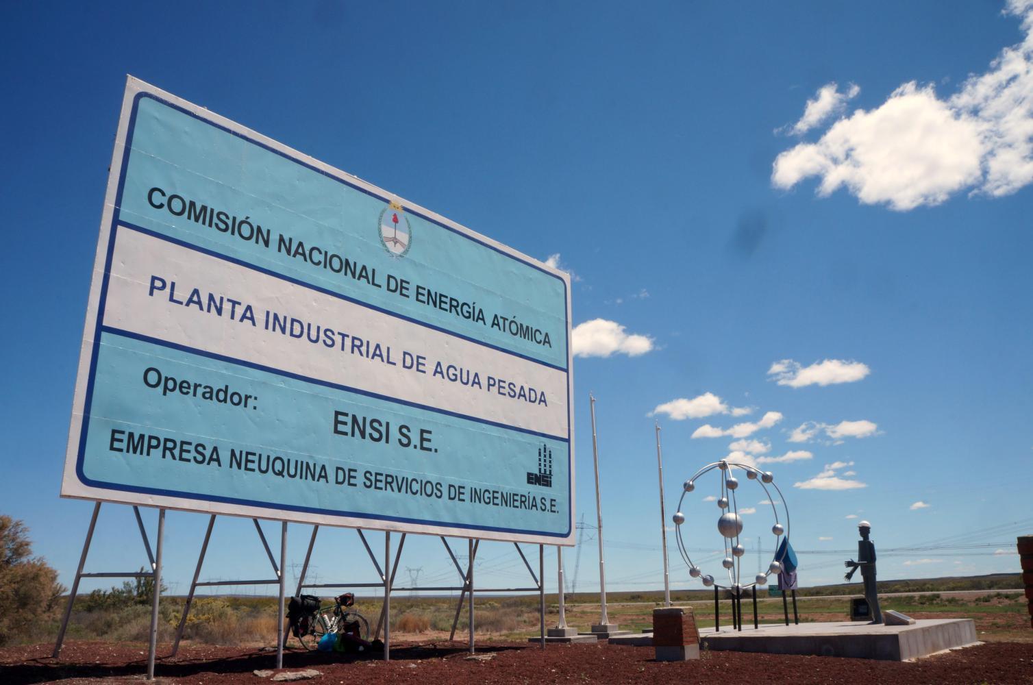The arrow straight road ahead, goes gently down the steppe, levelling out, then is seen rising up a fold to a level horizon. At this point I stop for lunch at the only shade, underneath a sign for an atomic power plant within a cluster of popular trees up a slope to the left. It says on the sign "Agua Pesada" heavy water. The only thing I can say is, Nazi-Germany were in the process of developing such a plant in occupied Norway for weapons use, when Norwegian resistance fighters sabotaged it. A film later made about it, was called "The Heroes of Telemark".