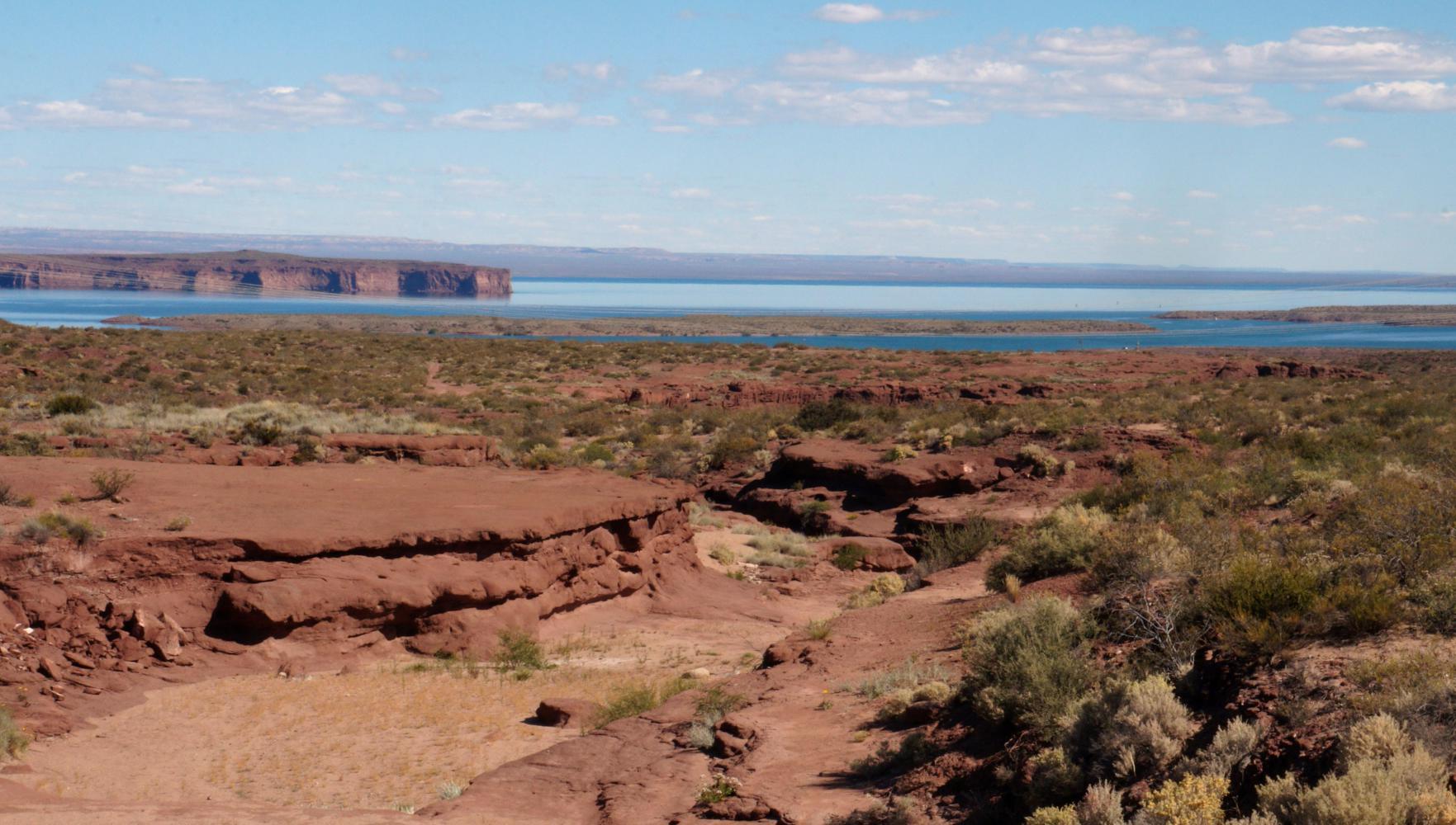 Once riding again, the abovementioned rise goes on for quite a way and when I said calm earlier, well in Patagonia there's always wind and "calm" therefore means breeze. The breeze rises to serious wind as I battle toward an ever unreachable crest. But it proves to go no further than a bluster, being manageable. And on crossing the crest, dies, from where a long sheet of lake come into view, light blue contrasting with red rock barranca cliffs below to the left and ahead.