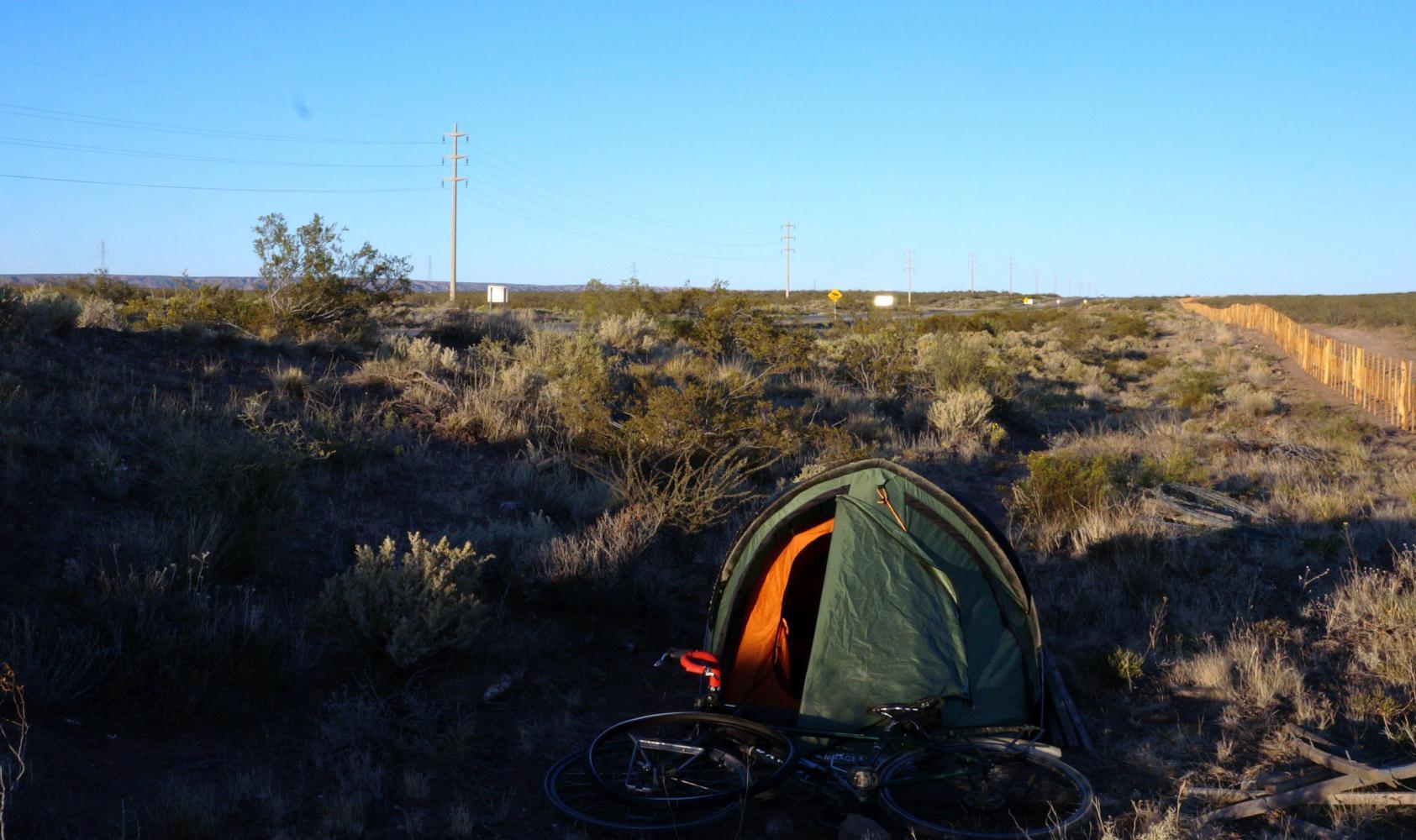 For the remainder of the afternoon I've lake off to the left and steppe rising to table-top hills to the right. I'm making progress and want to keep going until nightfall, but at eight o'clock, I come to a sign for road works and see ahead clouds of dust thrown up in the wake of vehicles passing over a temporary unsealed road to the side. So, rather than get filthy riding through dust, I look for a place to camp, which is easy, the wide verge having an elongated hump at the roadside most of the way, high enough to hide behind on level space between it and a stock fence.