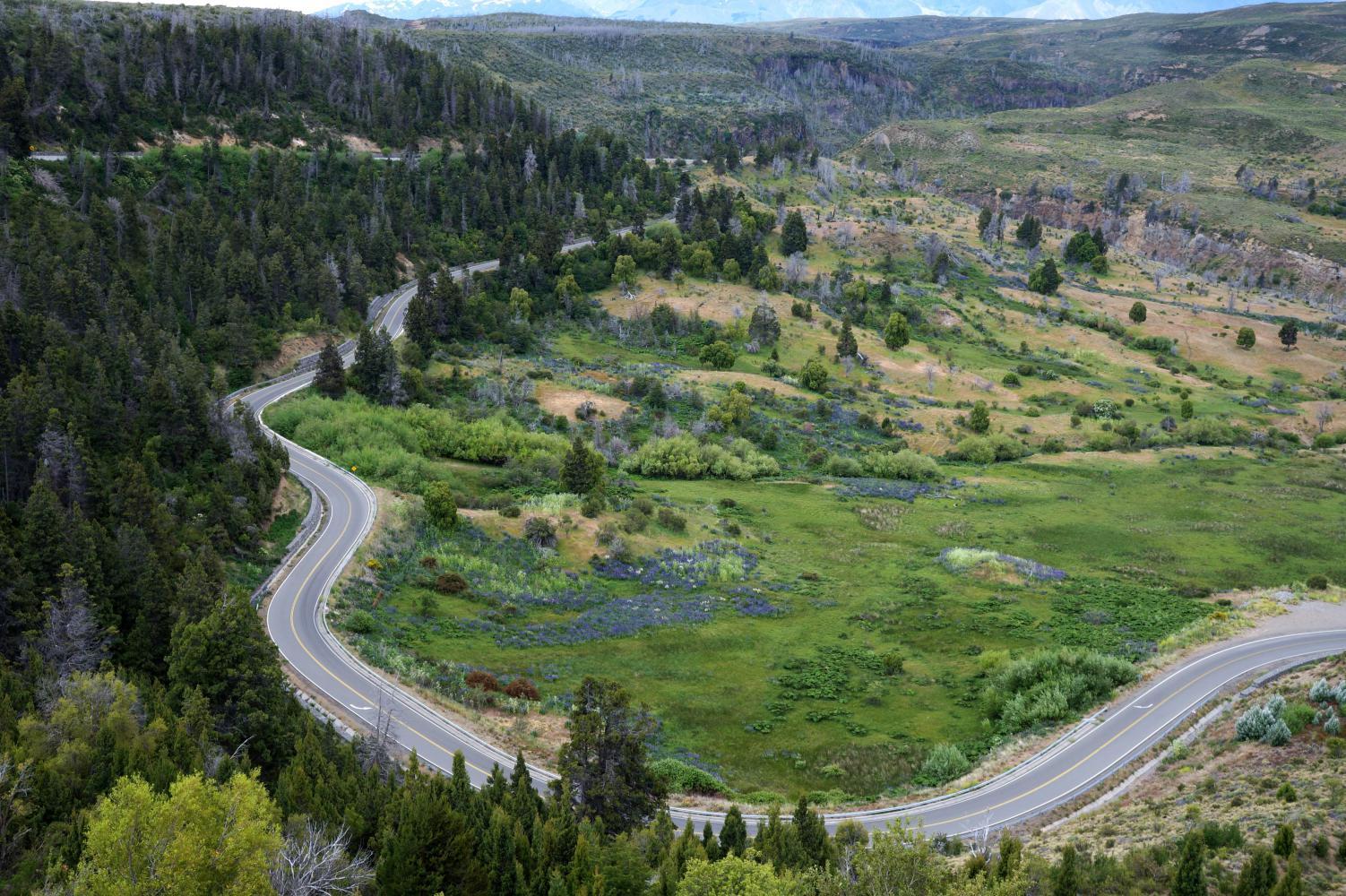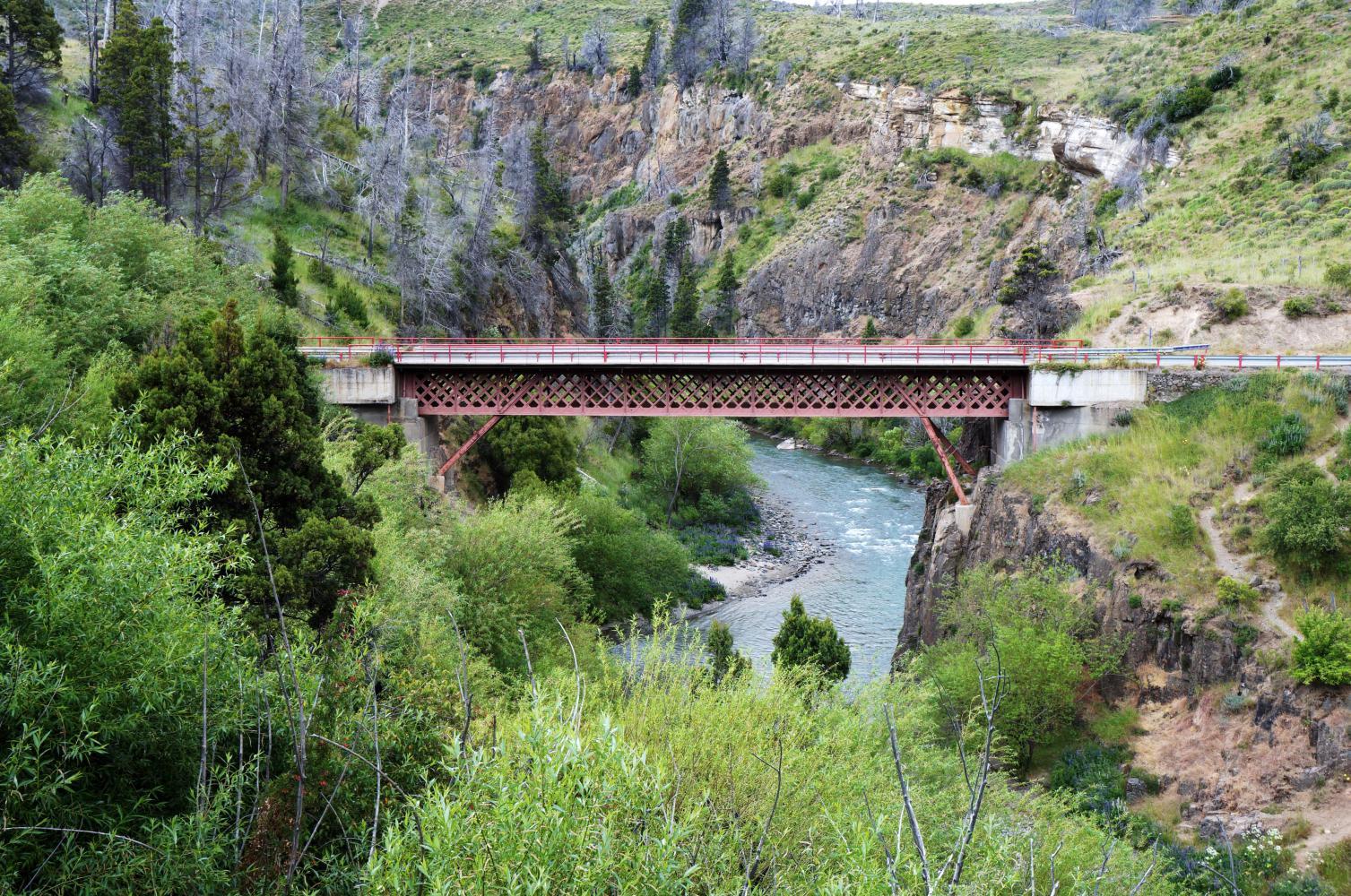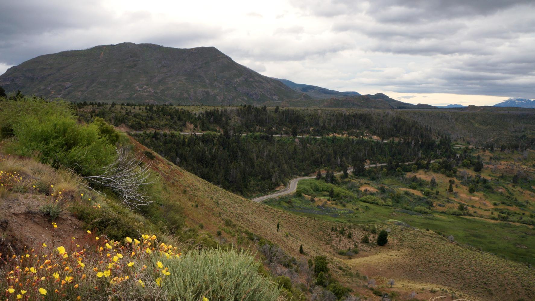 I am glad to turn left to see what this road is like. It continues along a height with a slope down on the left and a view across a still grey lake and back up the valley to the mountains from whence I came. There's pine forest along the right side. Then shortly the way opens up on the right with a steep drop to a valley stretching off to pale brown hills beyond. And soon turns sharply down a couple of steep switch-backs, descending into a gorge to cross Rio Percy via an old iron bridge. Then climbs the other side and follows up from the river a bit before the river curves off to the south west.