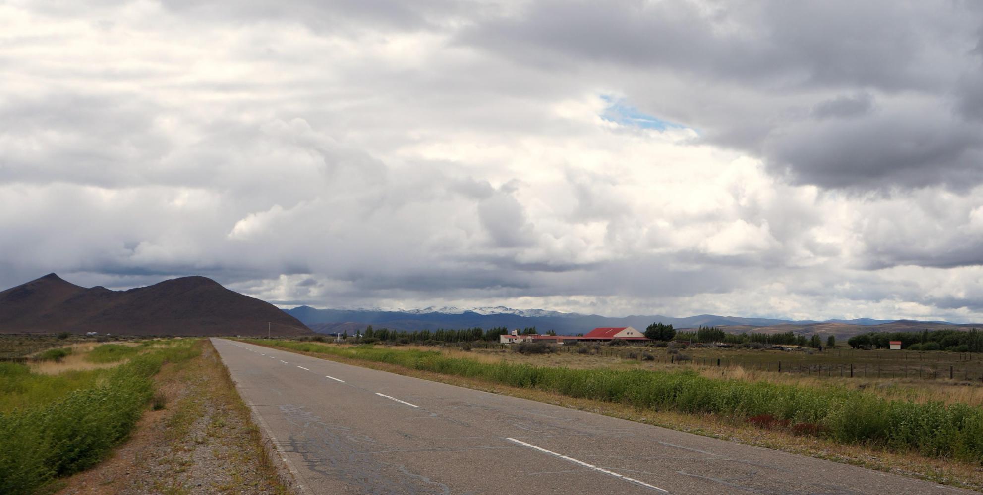 Further on toward Gobenador Costa, the sky has mellowed somewhat, but continues pouring down. The steppe has given way to greener river valley with sheep estancias enclosed in tall tree windbreaks. And to the right at one point, hundreds of sheep look up in curiosity at me passing.