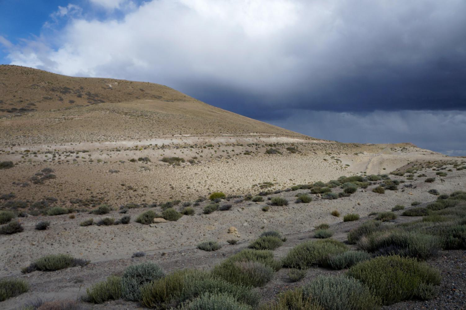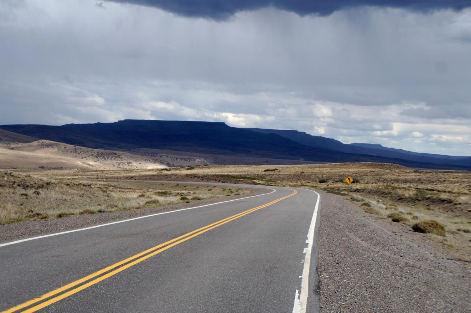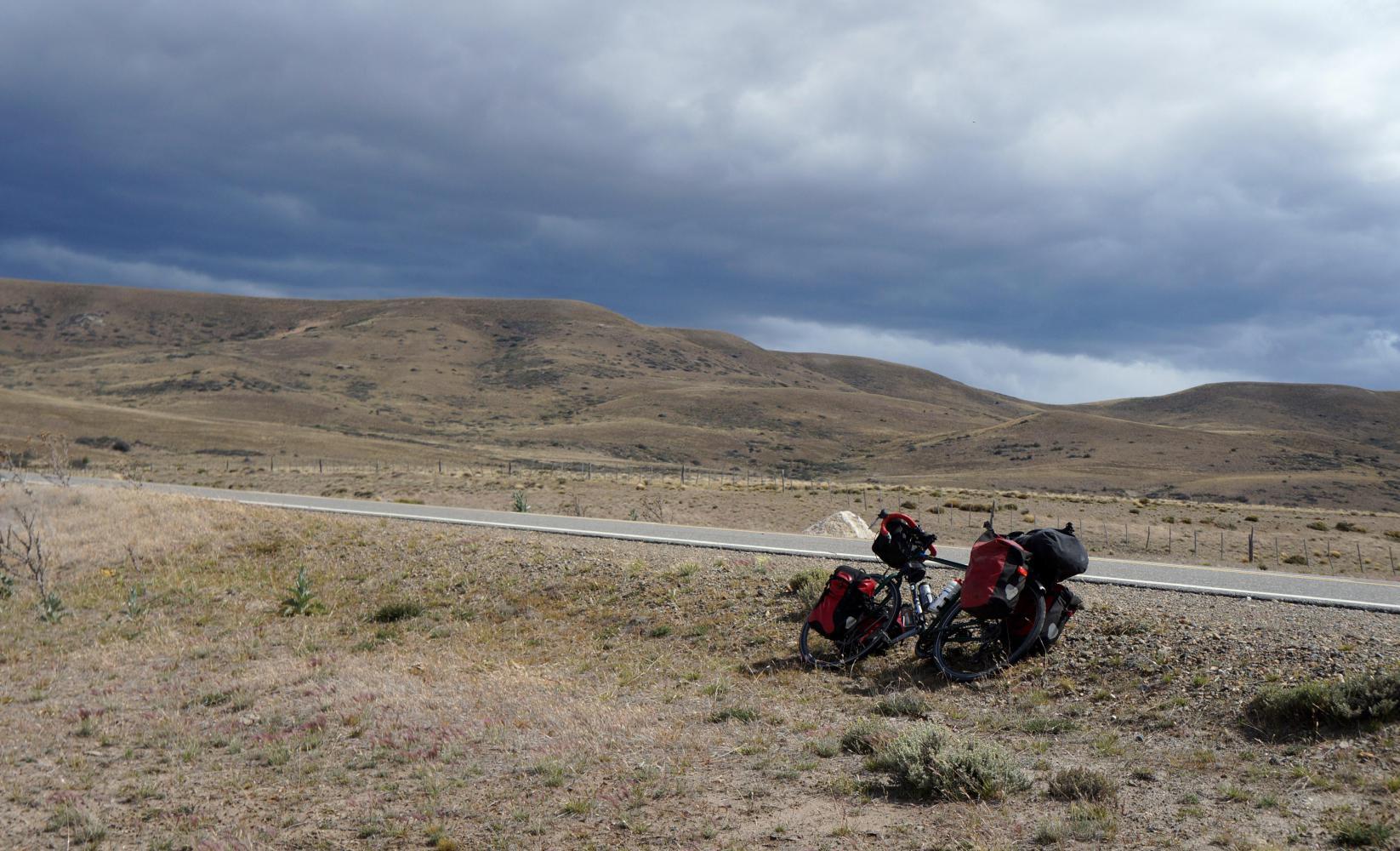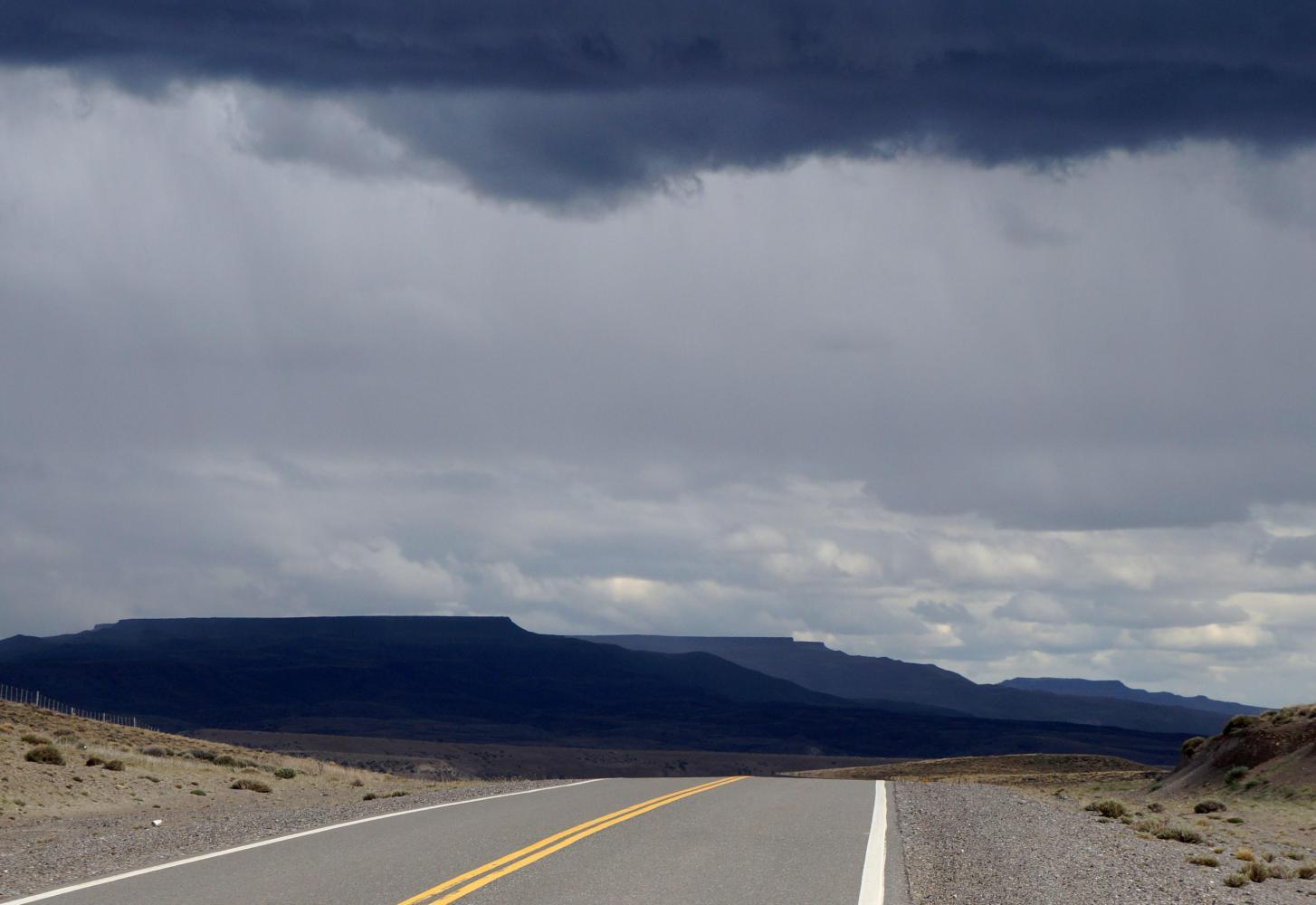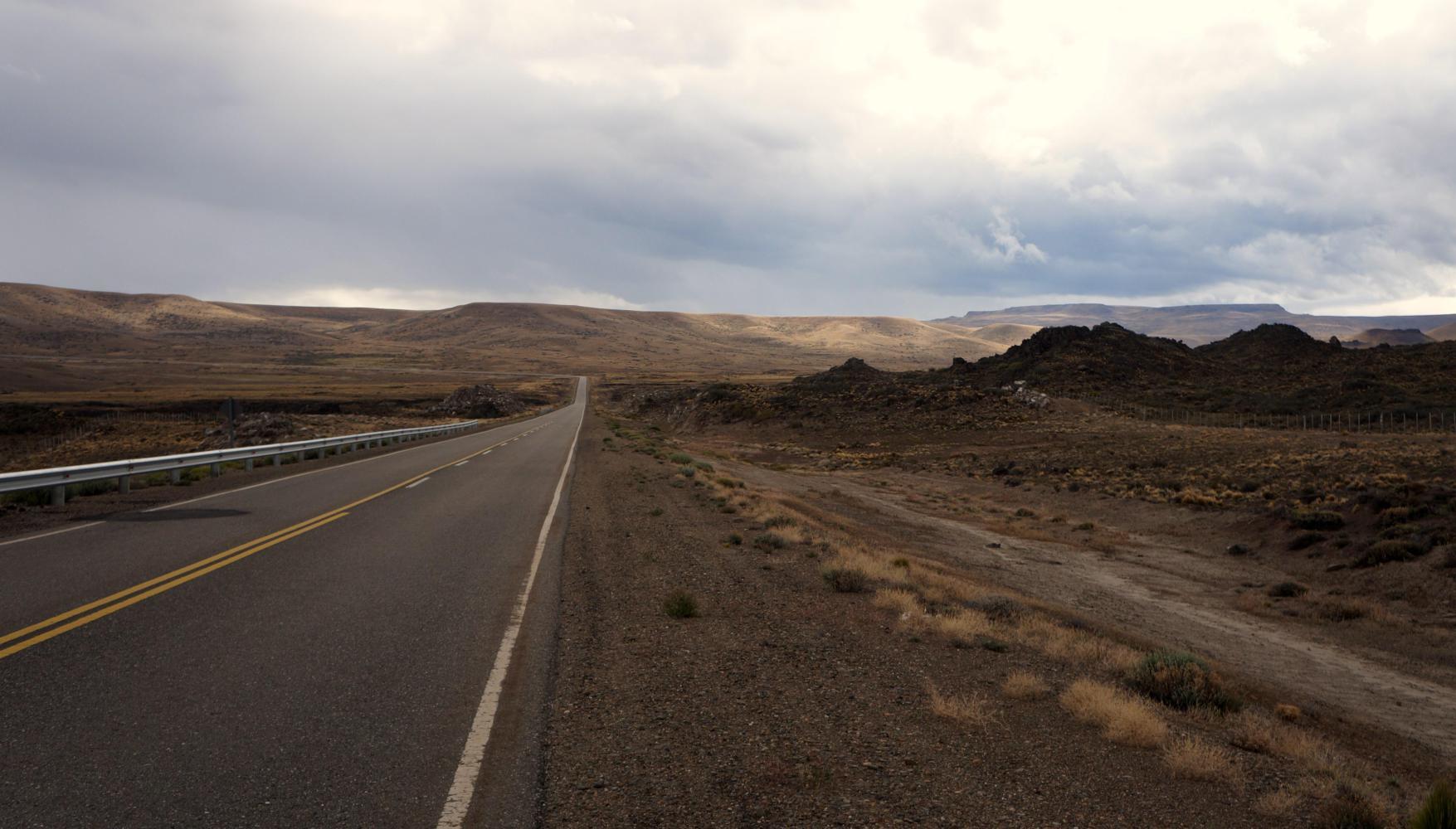 By now dark cloud has rolled in from the west and it is raining not far ahead, though, other than extreme dull light, doesn't reach me as I ride into a Sunday morning deserted town street, where I find a family run supermercado open and buy all the rice, polenta, packet soup and cans of tuna I'll need until I reach El Calafate. There is only one town left between here and there to buy more in nearly seven-hundred kilometres.