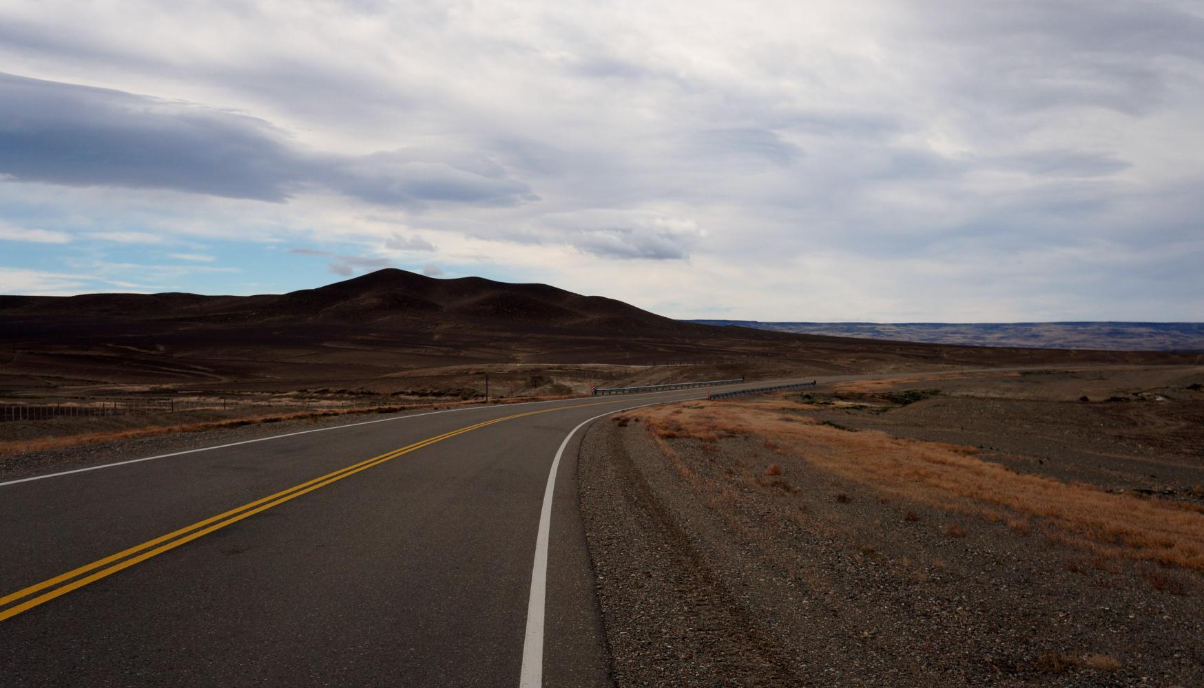 The afternoon is an arduous battle with the wind. For a long way I'm going gradually uphill, before continuing out upon a wide plain with wind half from the side and head-on. I want to reach Lago Cardiel by sunset. I can see the cleft of the lake ahead and hills rising beyond, but I never reach it. I do reach the end of the tarmac with a sign "200m. Fin de Pavemento" and another sign "Ruta en construcion la proxima 72km" The loose gravel road on is empty of traffic and banked and as it is nightfall, I wheel the bike down on the left, the sheltered side and pitch the tent: there being no alternative shelter out here.