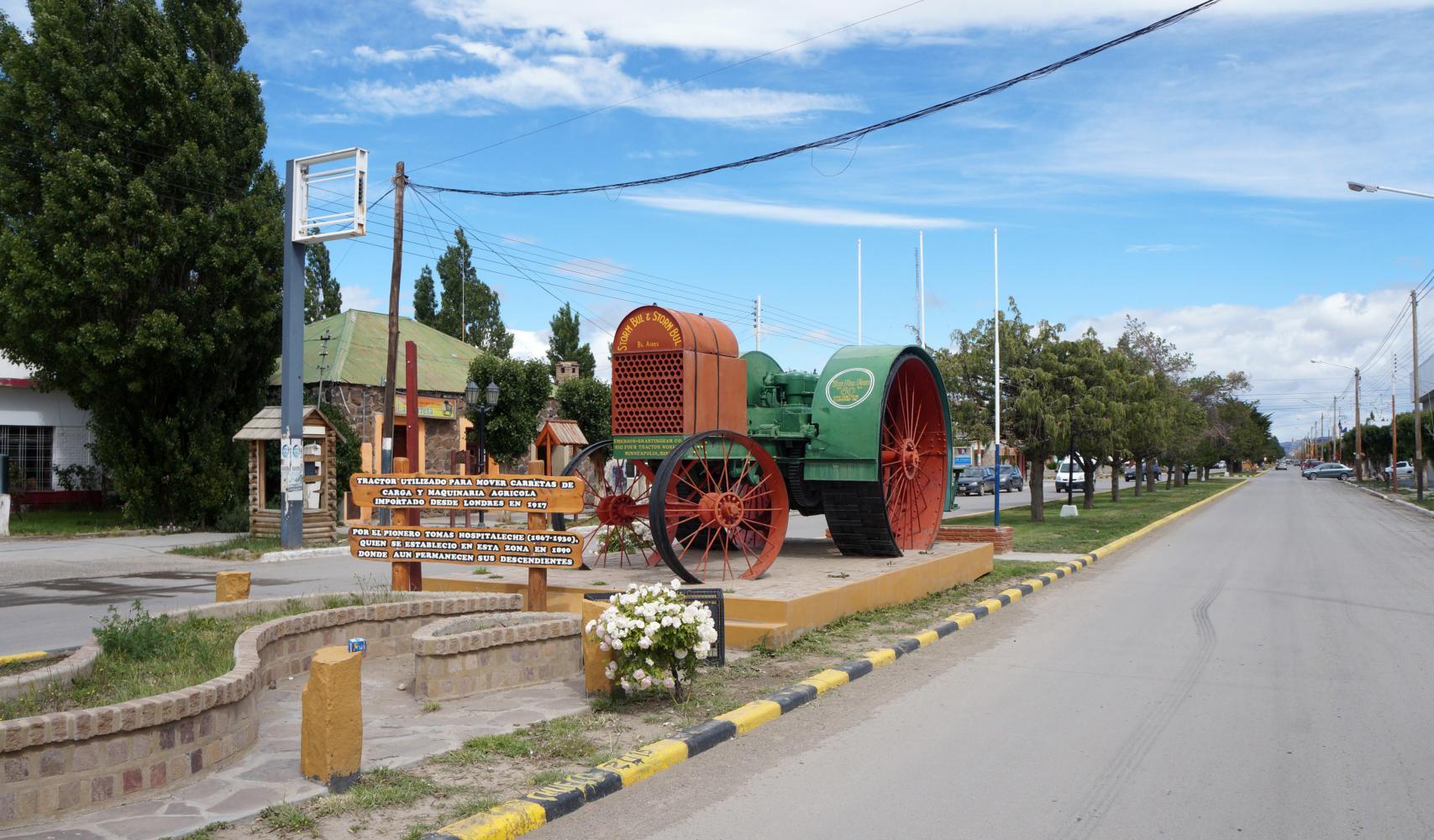 A group of three hitchhikers attired in warm jackets against windchill sit on the opposite side verge as I enter town. They look across at me pass with interest, wave and I give a return wave while continuing into town along the main avenue trying to remember where the municipal campsite was. Not that I'm considering stopping early, but it was where I camped in 2004, and so I am retracting the ghost of my younger self. I know it was along a side street on the far side of town, but which. Anyway, I take a photo of an old tractor owned by one of the town's pioneers, donated by a descendent to sit in the main avenue. Then go to an La Anomonia supermercado to buy bread and cheese and lots of other goodies for a late breakfast-early lunch. Afterwards wheel the bike with box of shopping across to a tree-full plaza opposite, where I picnic on the sheltered side of a boarded up kiosco, watching the wind whip through treetops.