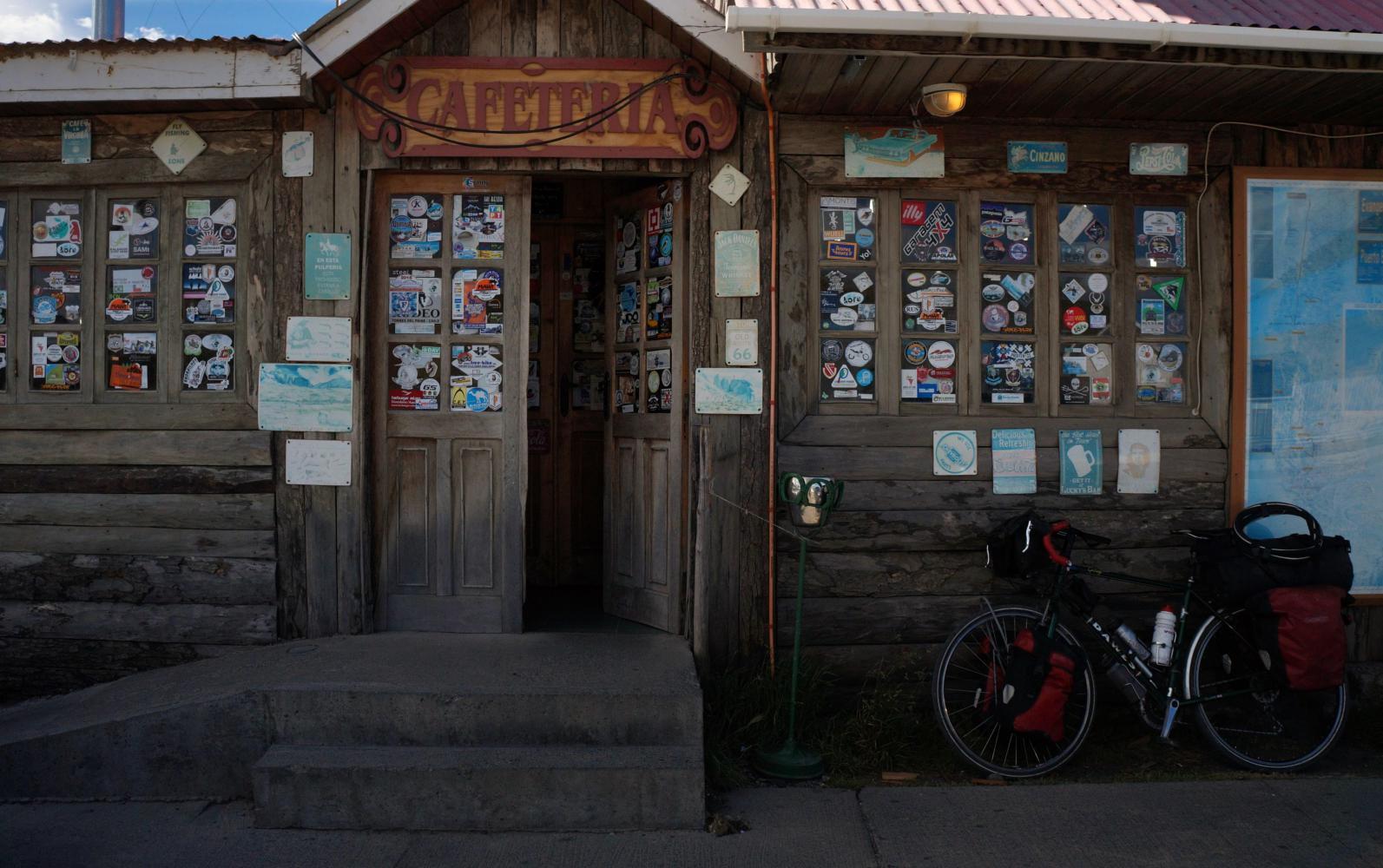 I push the bike out from the building's shelter avoiding the gravel the Czech cyclist came off on, then cycle much easier than before in the shelter of wooden and corrugated iron roofed houses to the first shop, a touristy place, the glass door plastered with travel stickers left by motorbikers who've passed this way. The most interesting thing for me, apart from rustic wood planked walls and corrugated iron roof, is a sign "Money changed" knowing that having some Chilean pesos to spend on energy full sugary things like biscuits will be necessary to get me through the next few days.