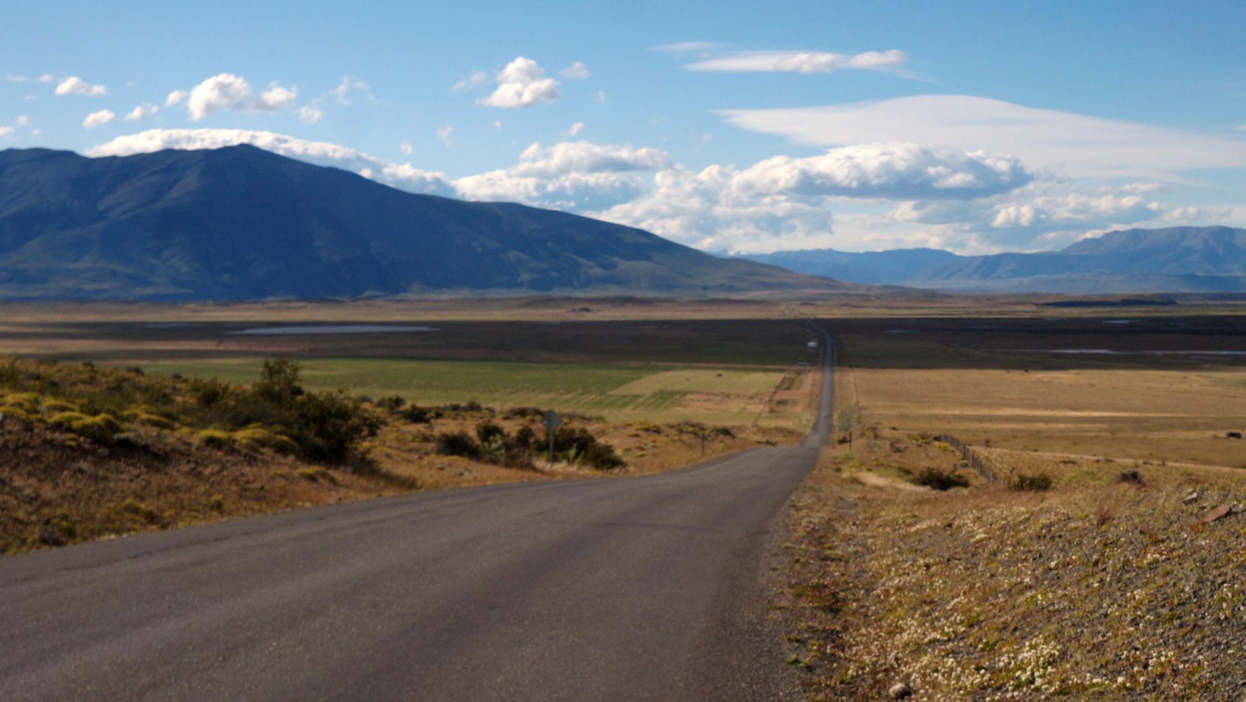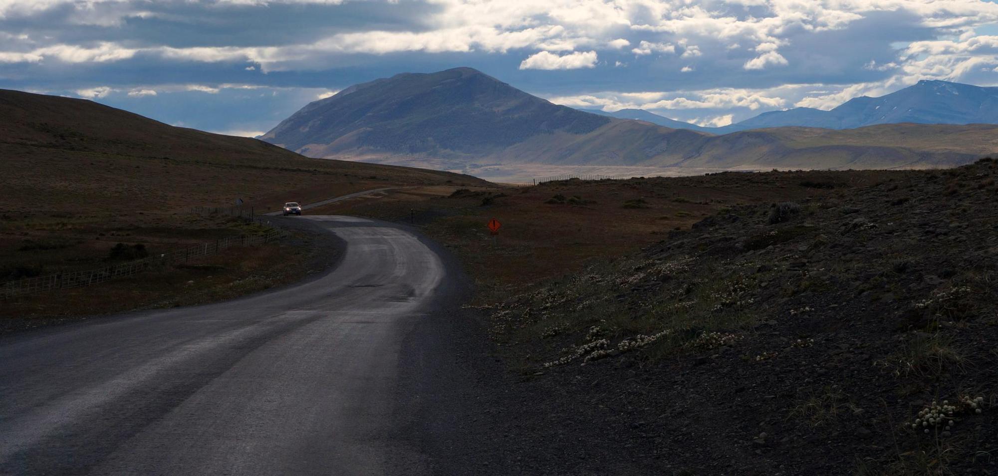 Although strong, the wind doesn't strengthen to the point where it is impossible to ride. It is a hard slog but at least I'm making some progress. Ahead is a range of hills like a wall, which the road gently ascents toward and shortly, I see ahead the right turnoff for a border crossing to Chile, that will take me to Torres del Paine. At this moment I'm of a mind to continue straight on, skipping the detour to the park and crossing into Chile via the crossing beyond Rio Turbio, all paved road and the small city of Puerto Natales reachable by evening; whereas, the turnoff will be more into the wind, riding upon ripio, with a few days more of wind and perhaps rain while living on rice. But as I draw level with the right turn, I think I'll see what the road is like anyway.