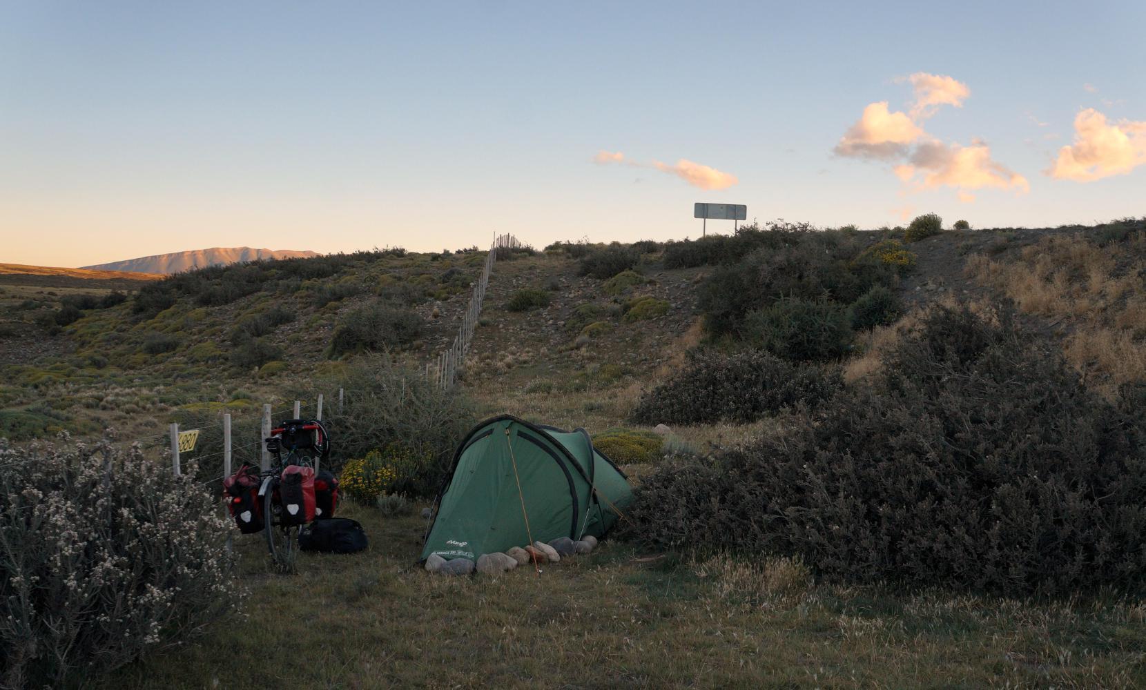 Ahead the wind is not only more to the rear, it moderates to a less forceful breeze. An hour or so later I'm stopped taking a photo when a shadow of a cyclist cripes in on my side. The Czech cyclist again. We cycle on together until we come to where the road has a bank down on the right, providing good shelter and level grass at the bottom along a fence, where I decide to pitch the tent. He says he'll ride on to a river as he needs water.