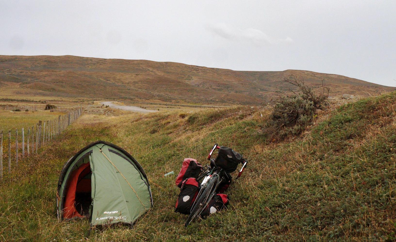 A kilometre or so further the valley and road come to a tee with a long valley from left to right, my road right, signposted Sombrero 15km. And with tailwind now I cycle about 7km until the road swings left and wind become crosswind, but with a short rise out of the valley, the road has been banked up approaching the climb providing reasonable shelter down on the right side, where there's a small rivulet stream and lush grass along the fence. I pitch the tent although not hidden from the road, the only traffic is an occasional oil-worker pickup truck, which will stop soon when they've all gone home for the evening.
