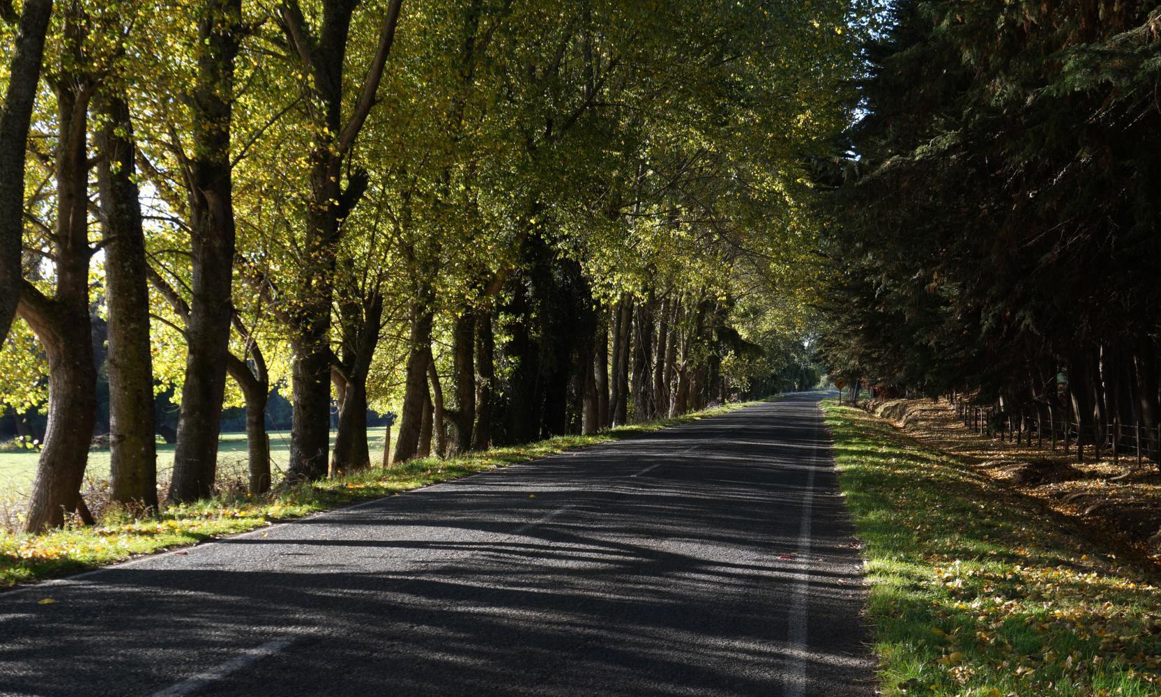 The way is flat until a descent down into a gorge with forest on either side of the road climbing up the other side of a bridge over a river at the bottom. On the climb up there's a track up a cutting on the left, which I at once ride off upon, knowing this will most likely do. The track then ends level with a firebreak and the fence has loose strands of barbed wire, which I raise and push the bike underneath. There is a single-track trail through long grass further, along to rows of eucalyptus trees, level in between with a mulch of fallen leaves, ideal to sleep upon, so I set about pitching the tent.