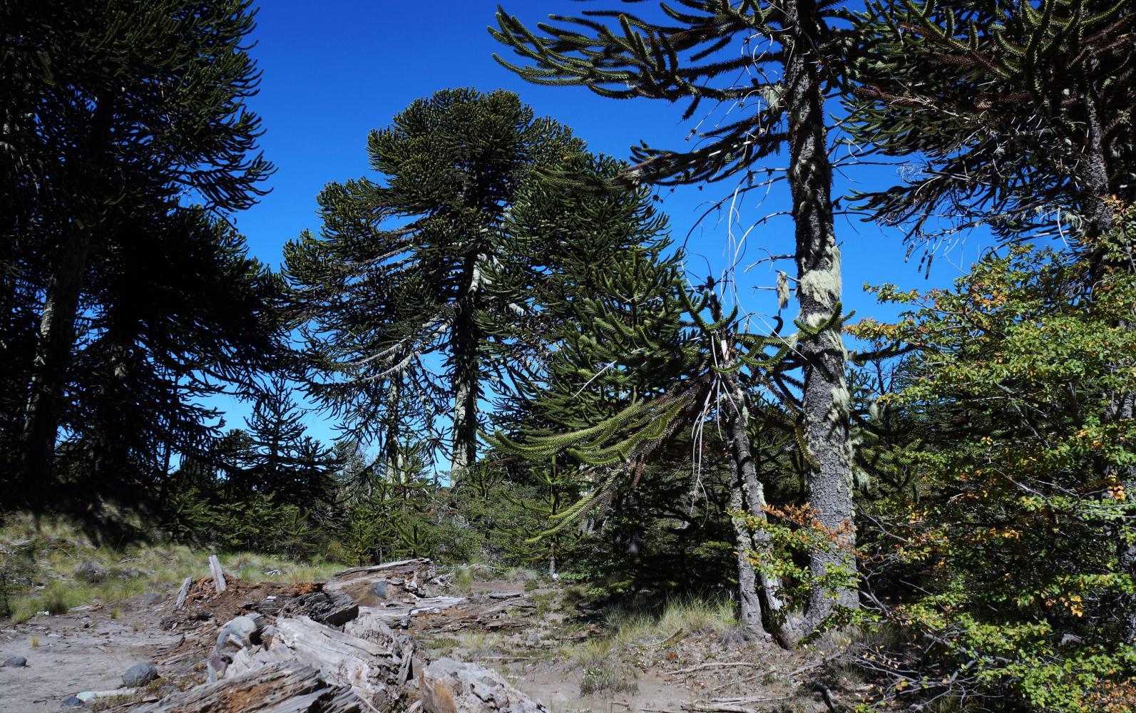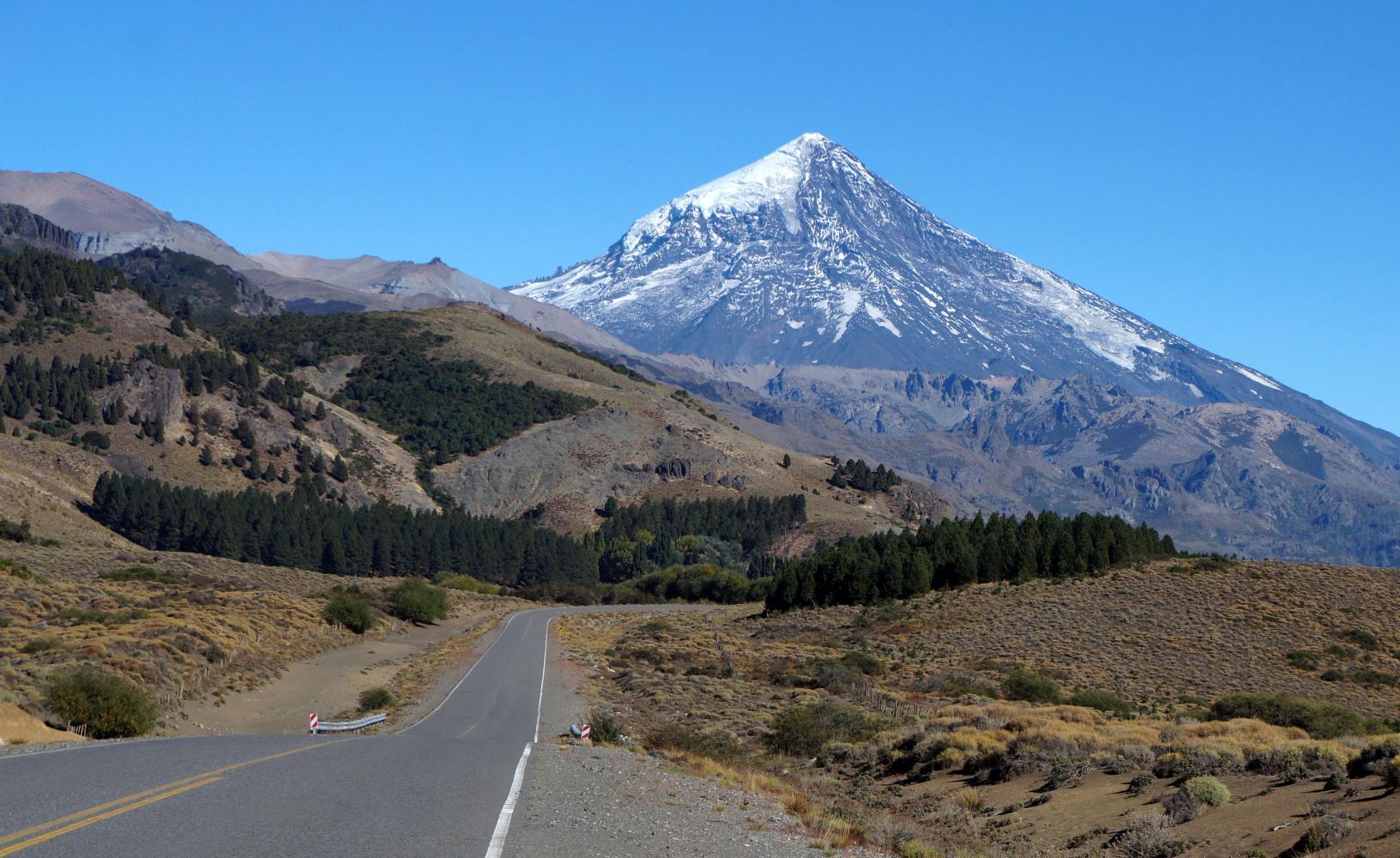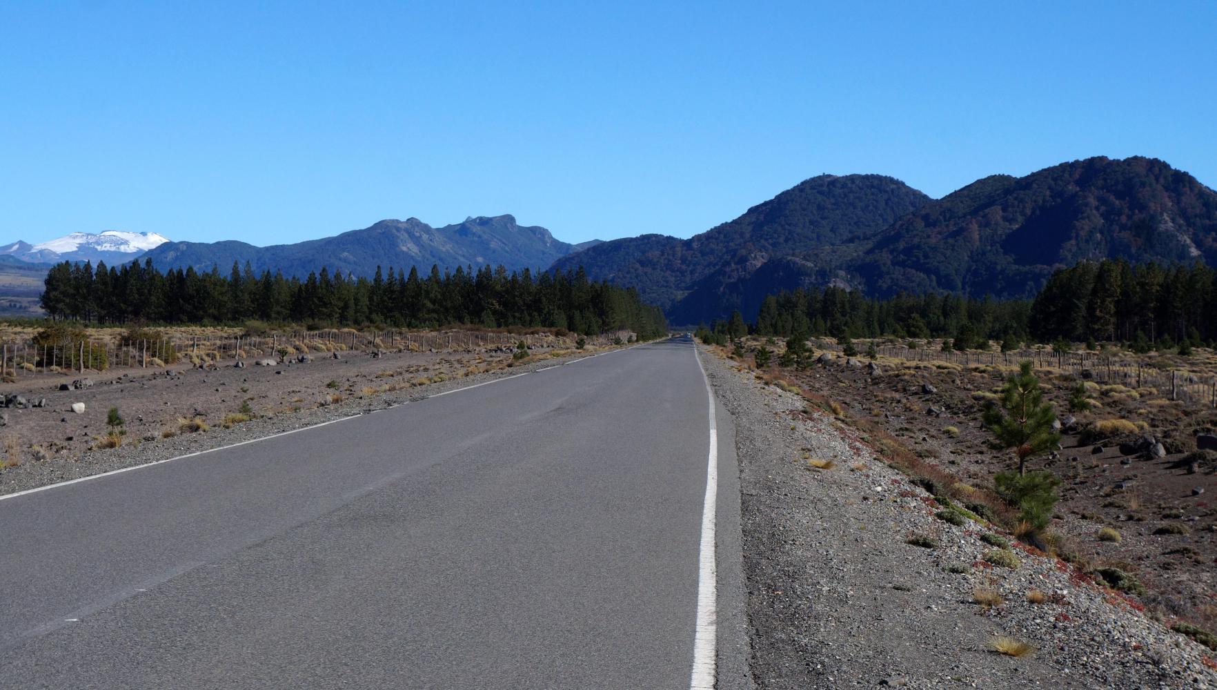 Pine plantations to the side continue for some way; mainly regulated lines of young trees, but a few blocks of mature trees there amongst, like where I'd camped. The main natural feature is the conical volcano Lanin, just ahead to begin with, then flanking the left side; by which time I've passed the last of the plantation and the right side is open steppe across to wooded hills.