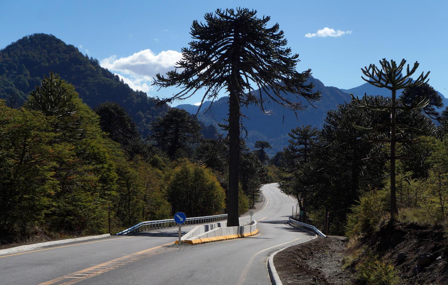 I had been on this road in 2006. Then it was all unpaved the forty or so kilometres before the border and a further thirty kilometres on the Chilean side where loose and rough ripio until reaching tarmac. And so I was glad to see the road now sealed in the intervening years, having ridden enough unpaved roads over the years to do a lifetime. It come then as a disappointment further on when, I come to the entrance to Lanin national park and find to the side a "Fin Pavemento" sign: the tarmac ends and road surface onward natural, which in this case is much like the track from where I'd camped back in the plantation, loose and sandy with a gradual climb up toward the border. The rear wheel spins out from under me and I'm off pushing much of the way until gaining the ascent. The road levelling out and I can trudge on slowly. About here a kind Argentine driver stops and hands me out a chocolate coated biscuit, which is much appreciated.