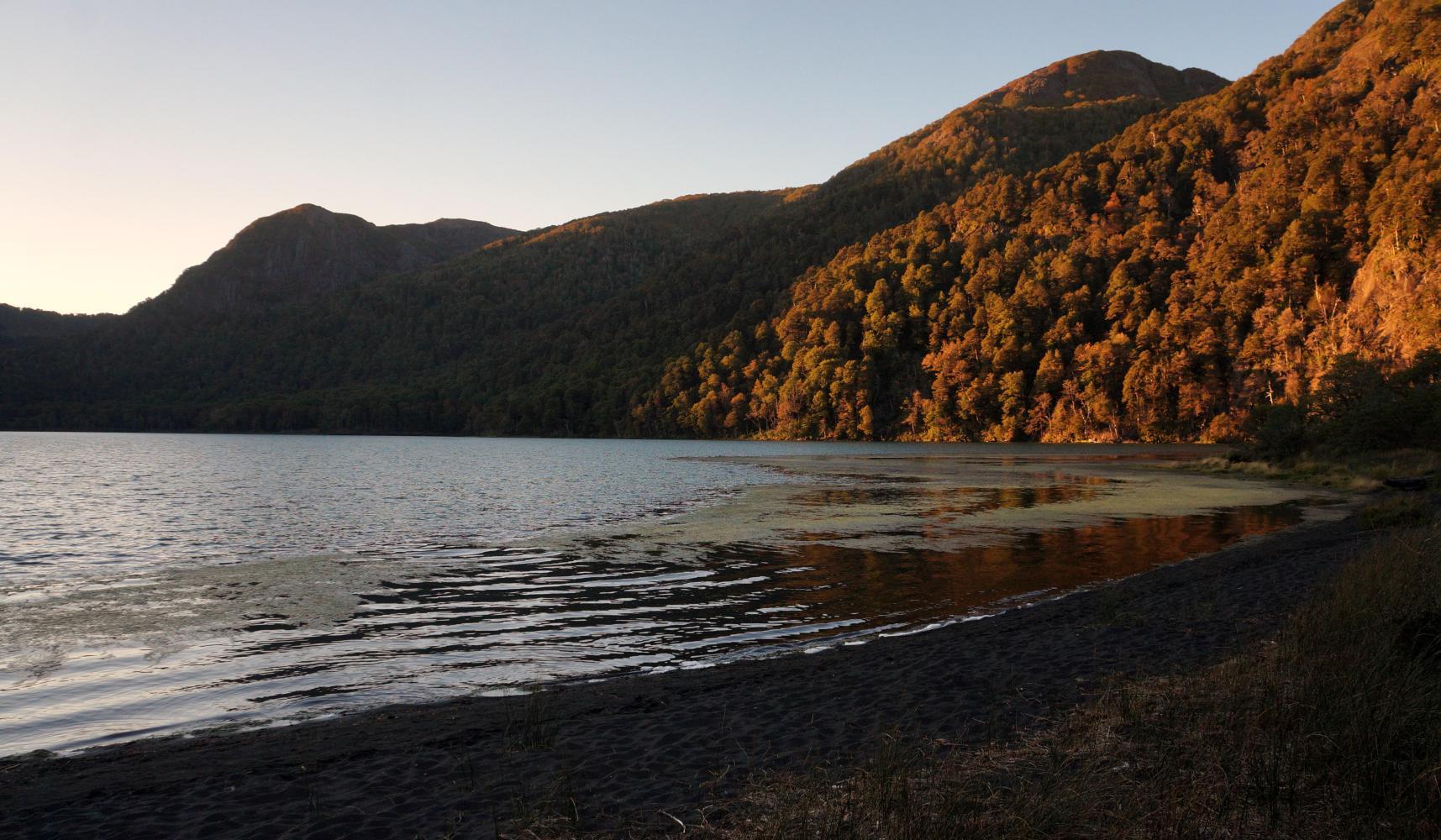 The tarmac starts immediately on the Chilean side of the border. The way downhill and in another national park with a long name I didn't note. I only ride a few kilometres more when I come to a serene green lake with black volcanic sandy beach, an idea place to camp even though it is only three o'clock, but it is only 90km to Villarica, which is my gold for tomorrow, so I stop early. I remain sat on the lakeshore for the afternoon reading, then pitch the tent when the sun goes down.