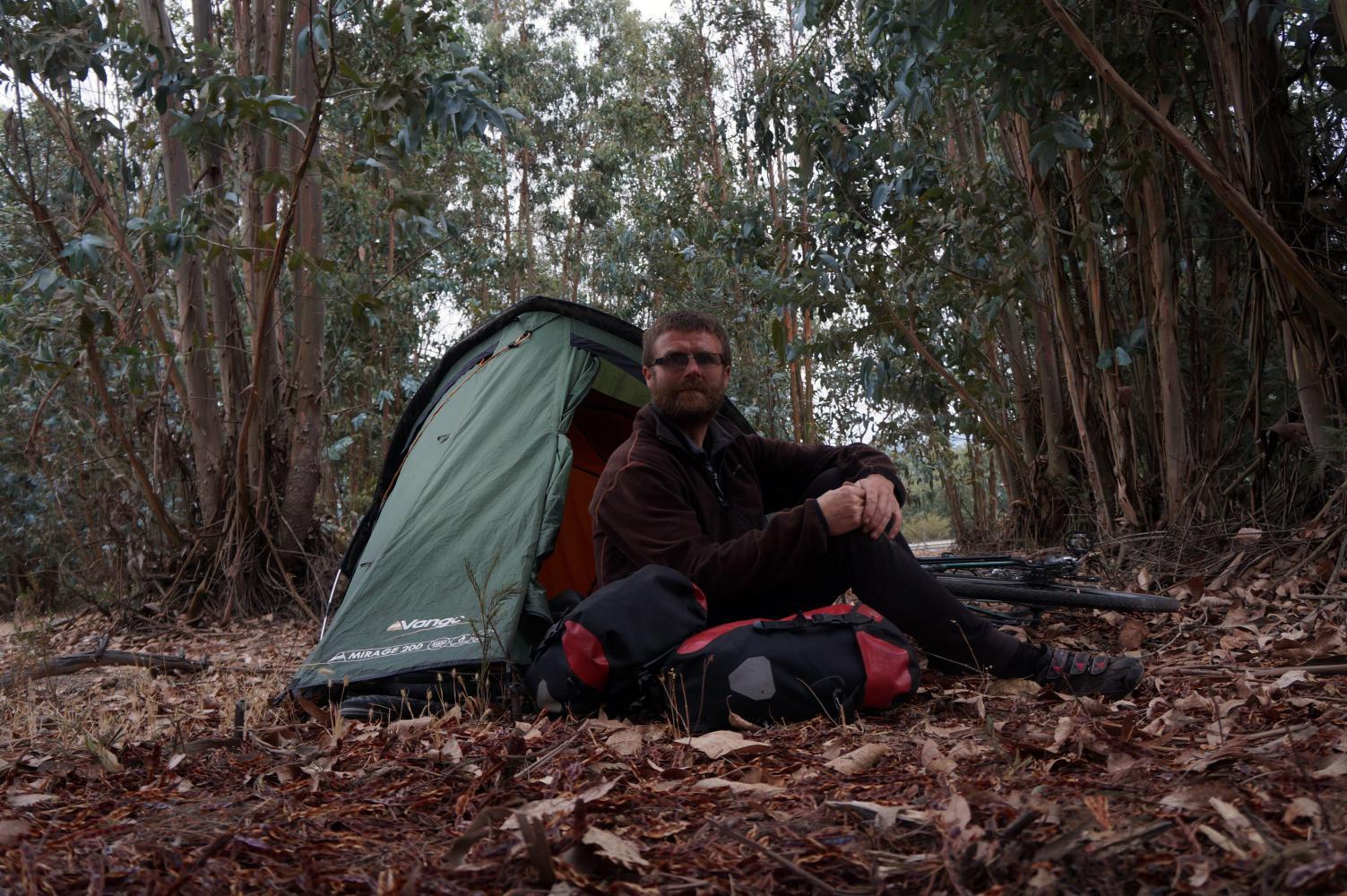 I ride for another hour when I halt at a gap in the fence into a plot which is part brown turf pasture, part eucalypus grove, finding a spot to pitch the tent a comfortable distance from the road therein. A powder dry place and well drained as it looks like it'll be a wet night.