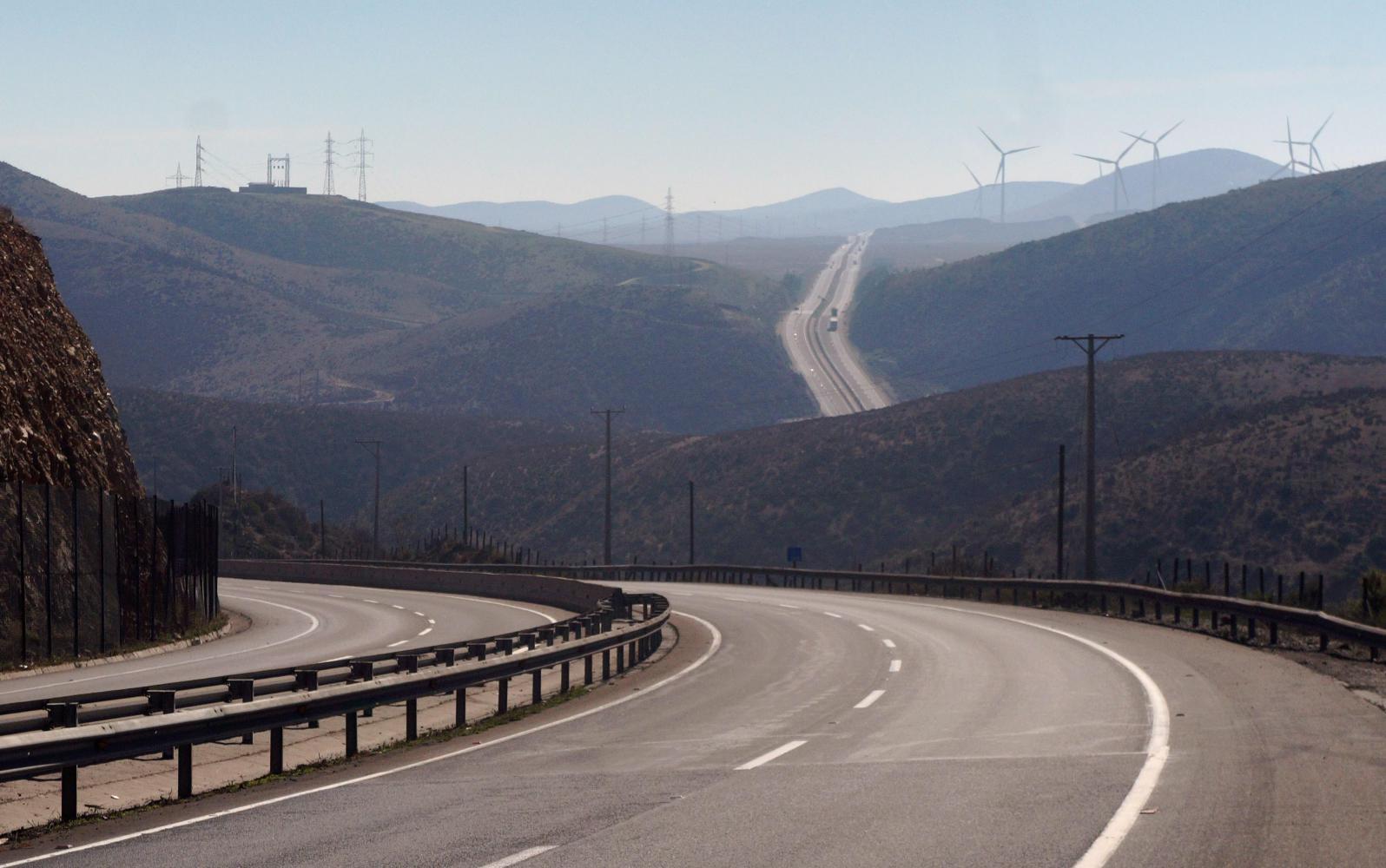 From the word go, the road is a beast, dropping down from my campsite, with a scattering of houses at the bottom of the canyon on either side, followed by an extremely steep climb out of the canyon up upon a plateau, the long brow of hills ahead lined with wind-turbines.