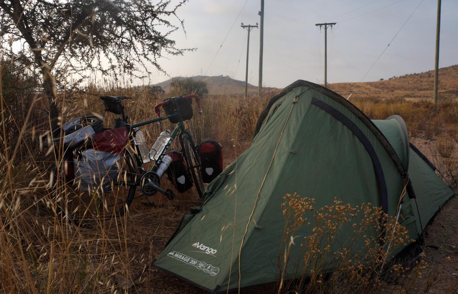 Though eventually, I come to a track off to mobile phone masks on a hilltop to the right, where the gate at the road is open. So I push my bike in and find a good tent pitch hidden from the road behind bushes.