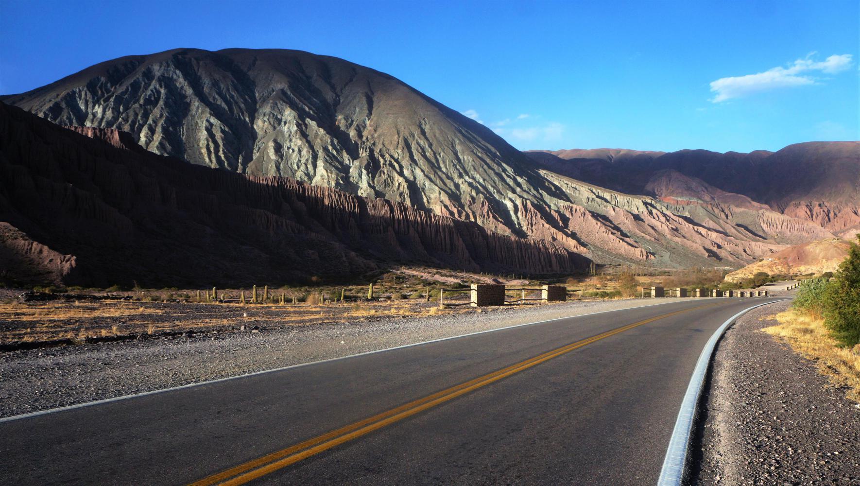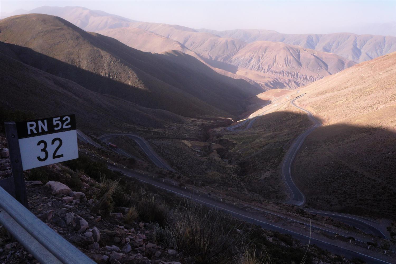 It is barely visible as downhill, but the plain is every so gradually downhill all the way to cross the salt flats basin of "Salinas Grande" where salt is mined and there's a visitor centre as it's a tourist attraction, well, a salt house but no amenities such as a café to get in out of the wind.