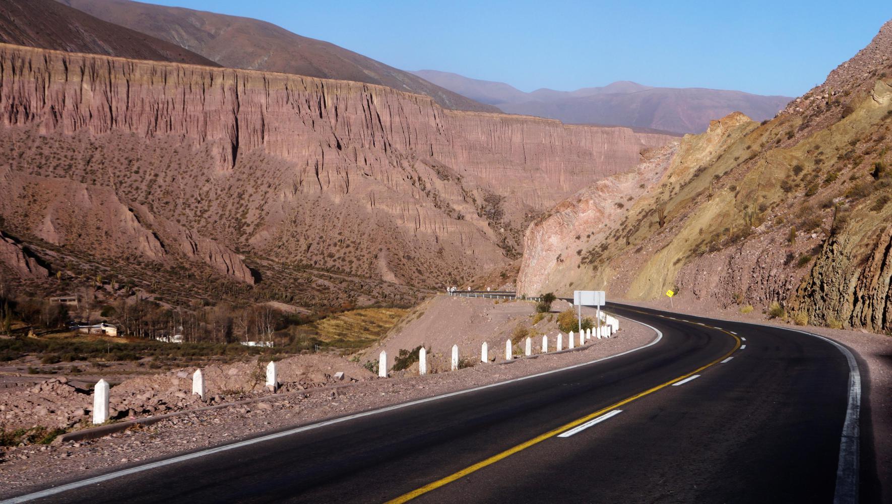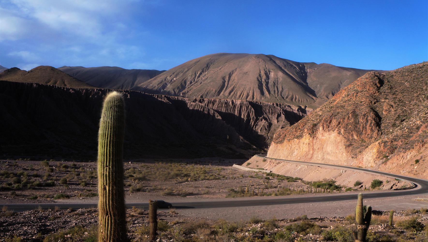 The town is situated in a dry river valley which the road on follows for only a kilometre before a steep climb winds up the hillside, where the wind changes to crosswind on a north to south section until the way swings east again upon the hilltop, where follows about fifteen kilometres down and then up through a chaos of hills. The wind varying from tail to crosswind as the road veers right and left. Then, descend steeply through a narrow canyon, where I see the first tree cactus, which don't grow higher than about 3600m altitude. A gladdening thought to be losing altitude.