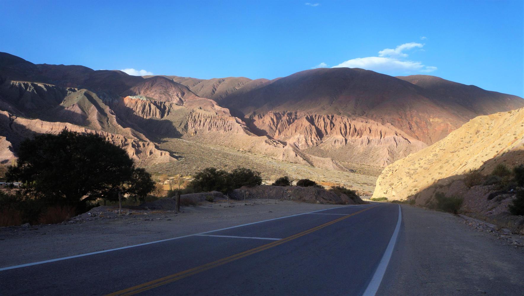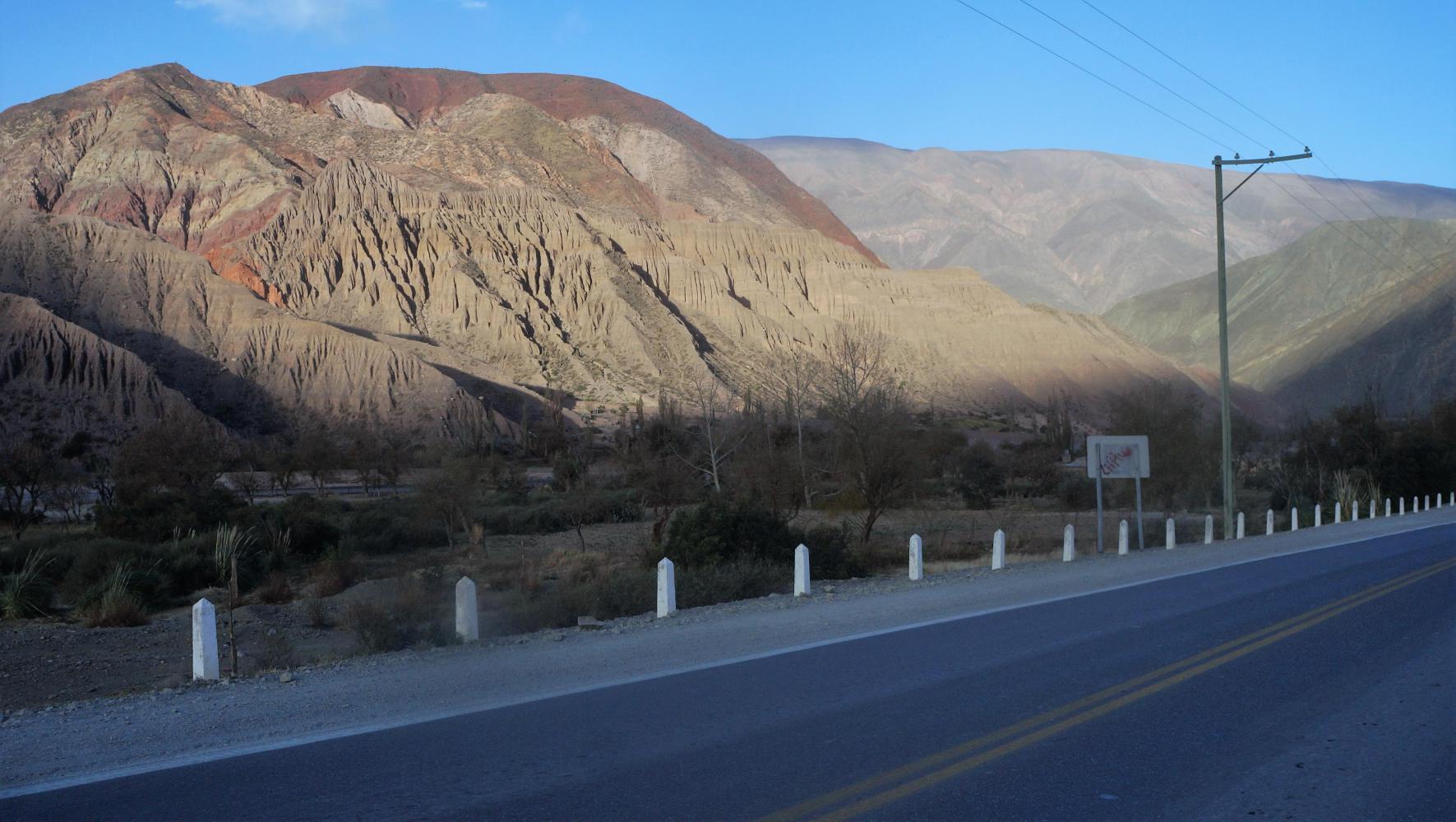 I descend the remainder of the afternoon, down through a bare rock valley of warm colours and cactus on lower slopes, where its milder and approach the village of Pumamarca, within an hour of nightfall, just as the late afternoon sun cast long shadows with rich colour in autumnal roadside trees. Deep blue sky with a few fragments of cloud.
