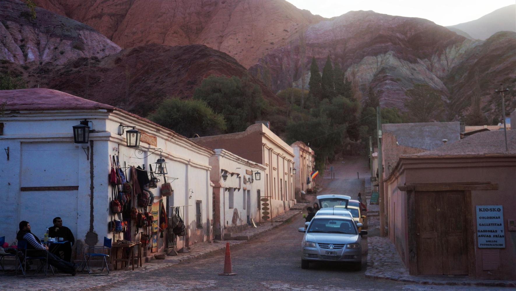 A short way on from where I'd camped I reach the small town of Susques, with unpaved street with low crumbling plaster adobe houses either side, where a gust of wind blows a cloud of dust along. The place reminds me of Bolivia, as the inhabitants, a group of men on the street corner chatting and laughing as I pass are short and dark indigenous, so too is a woman shopkeeper standing in the doorway of her shop. She laughs too, seeming to find me on a bike amusing. She doesn't stock anything other than soft drinks and sweets, but there's a shop next door where I buy an apple and two bananas, which the old woman behind the counter excepts a torn in half five peso banknote for, as I don't have smaller change.