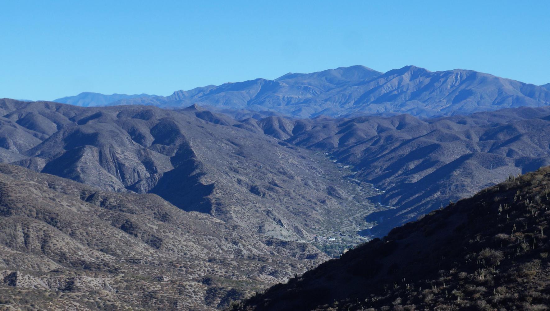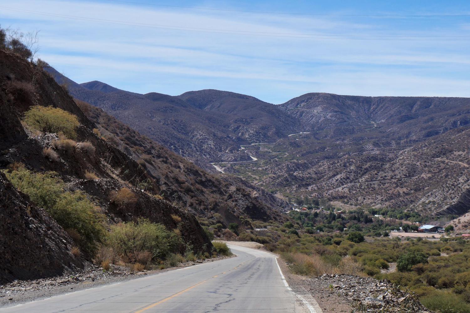 There is a climb away from the town where I bought the coke, which I manage to keep turning the biggest sprocket up without a stop for breath until rising out upon a thorn bush clad valley with another short climb 10km ahead out through the brownish hills enclosing the valley: the road crossing a summit with an almighty steep descent into a deep gorge, which is great to begin with, until turning a bend, I see the road zigzag rather steeply up the hillside on the opposite side.