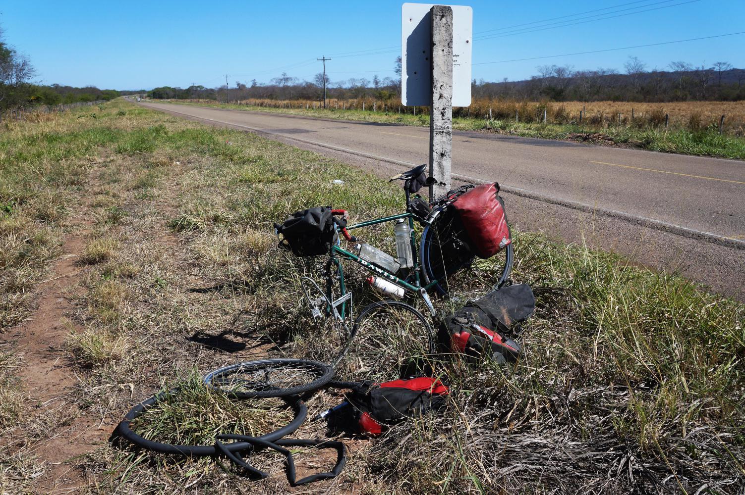 Only 20 minutes on from my lunch stop, there's that familiar heaviness in the front wheel when steering. Another puncture. I make it to a kilometre marker post in the grass verge to lean the bike against while repairing it. The inner-tube fails to inflate when I pump it, whatever caused the puncture, the air's escaping too fast. I cannot inflate it in order to find a hole to patch, so have to resort to putting in my last reliable inner-tube, one of two spares, the other has a mysterious leak of air, thereby staying up (inflated) no time.