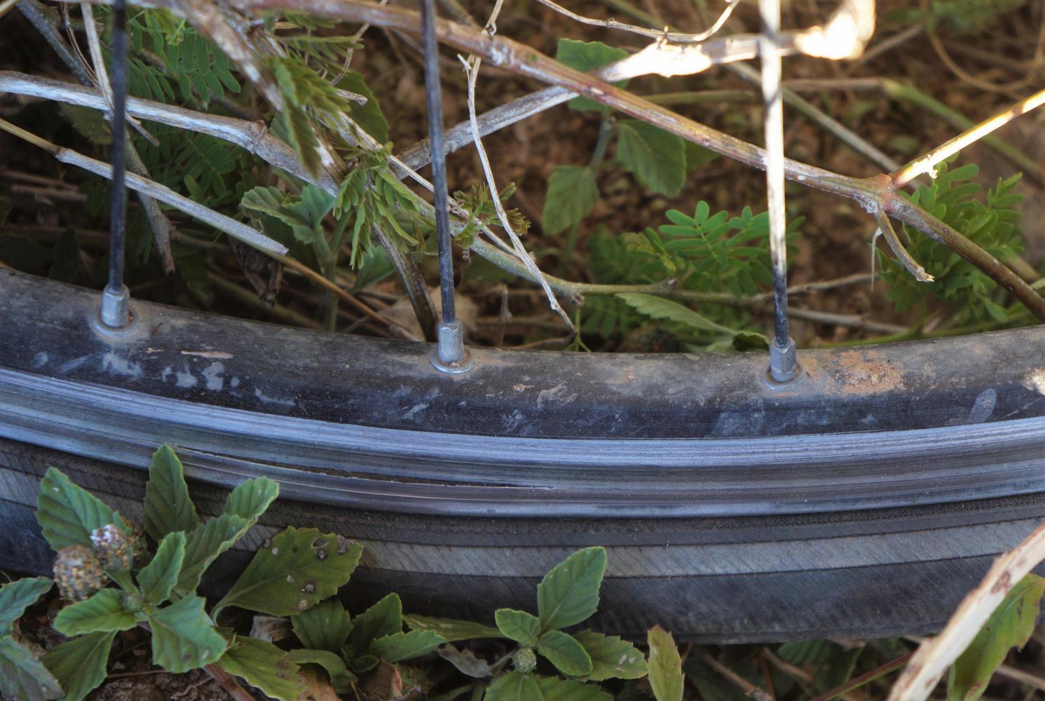 Later with an hour left before having to look for somewhere to camp, making good progress and thinking I'll have a short easy day to Santa Cruz in the morning, there's a sudden soft thump sound from the rear-wheel, followed by a continuous knock with each revolution of the wheel. I stop immediately, realising quickly the knock is the rim hitting the brake-pad, but know a spoke hasn't broken, because the initial thump sound would've been loud and abrupt. Then wheeling the bike slowly forward while looking at the rear wheel turn, see there's a bulge in the rim touching the brake-pad as I thought. The rim's splayed out; split due to too much braking wear.