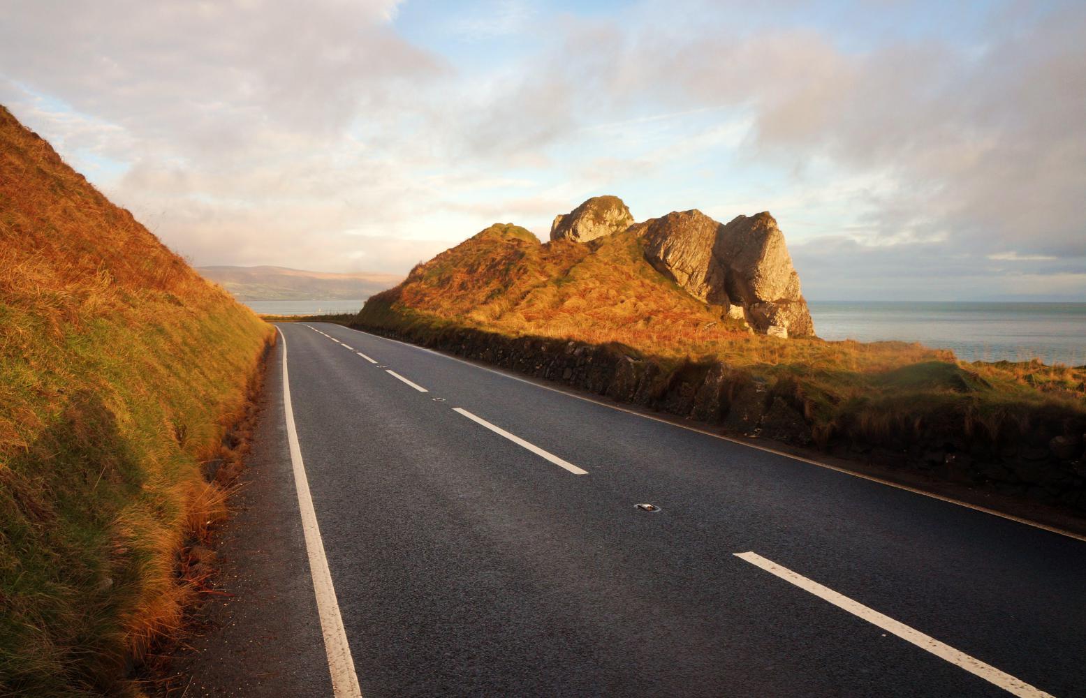 The work men turn up at eight the following morning as I take down the tent and leave. The road is damp, it having rained more during the night. I return back along the carriageway to the roundabout and cross over to continue on a byroad north and after five or six miles of up and down, re-join the A2, the main Antrim coast road.