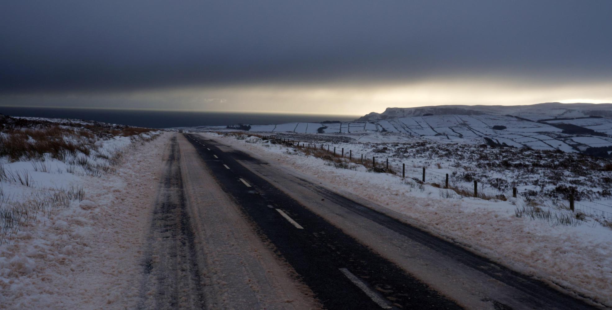 once I descend to the coast at Cushendall, the road onwards is a wet sheen and the day remains calm and at the same time, an ever changing mix of blue and dirty white skies with snow flurries. Then turns greyer further south; like rain, but it holds off until reaching Belfast at dusk, when it comes on blinding sleet in the city, turning to a whiteout of big slops of snow on the long steady climb south out of the city. Now dark, the rush-hour traffic is a constant stream, conditions are appalling, but I ride on the footpath, which is bumpy foot-trampled snow.