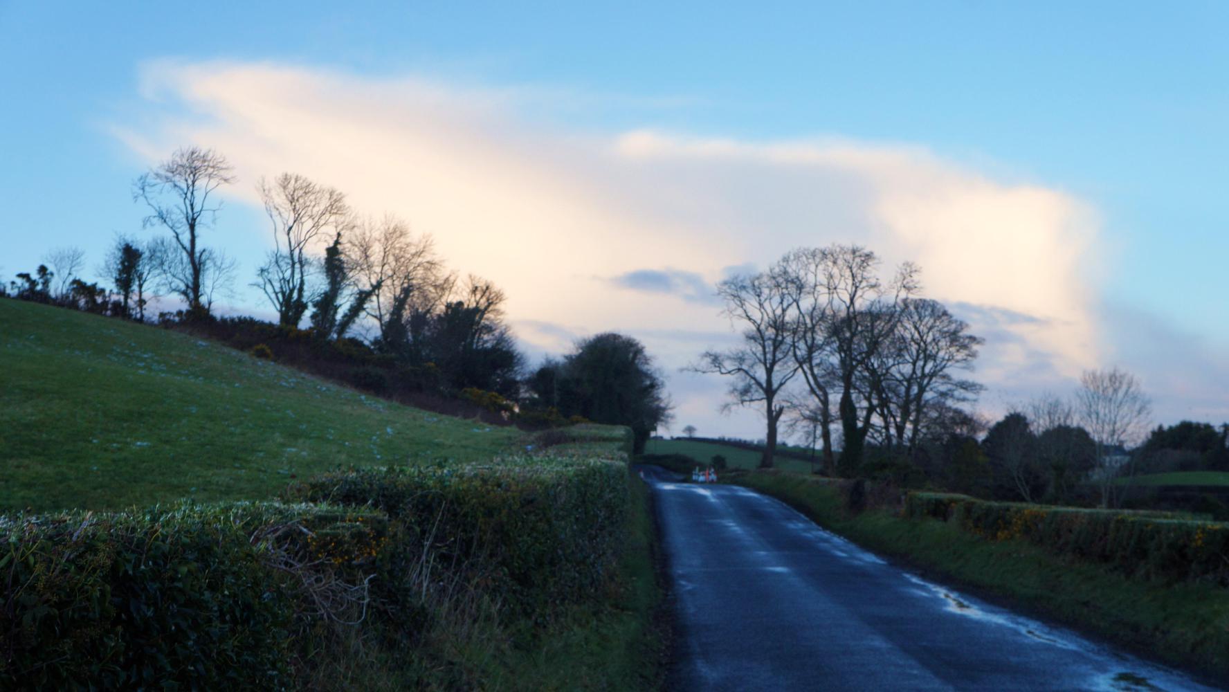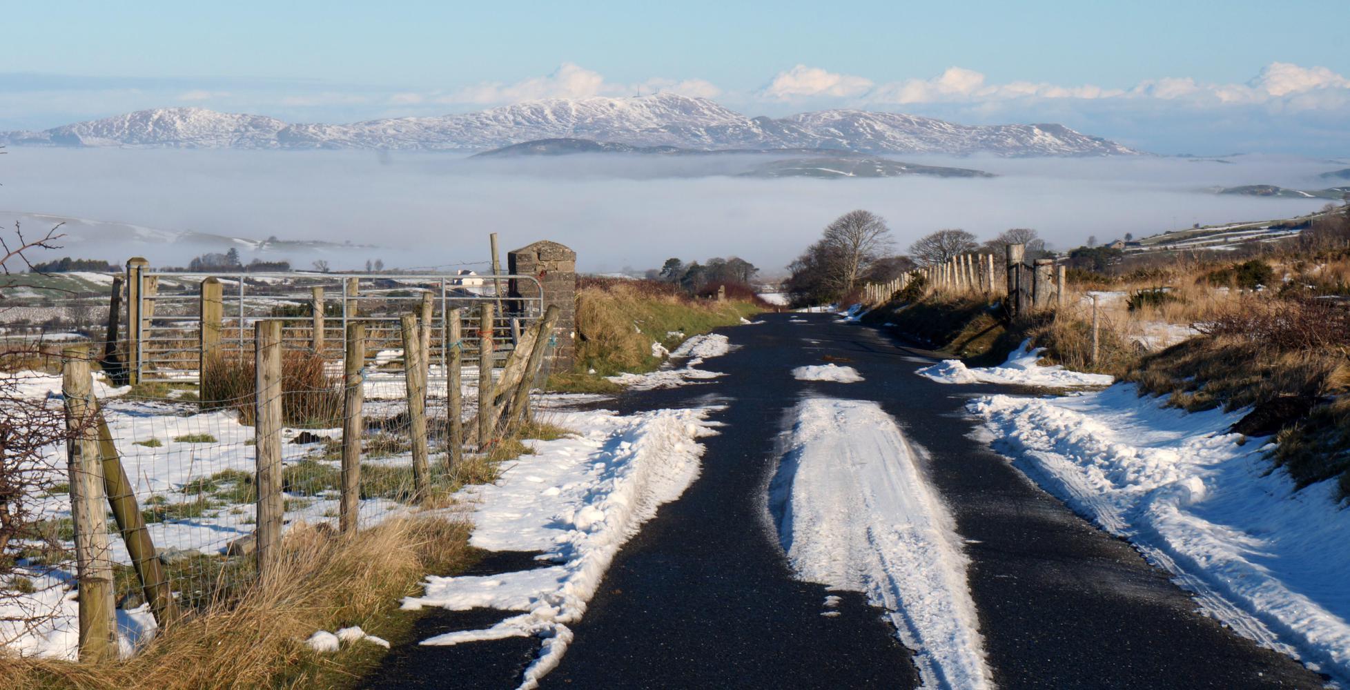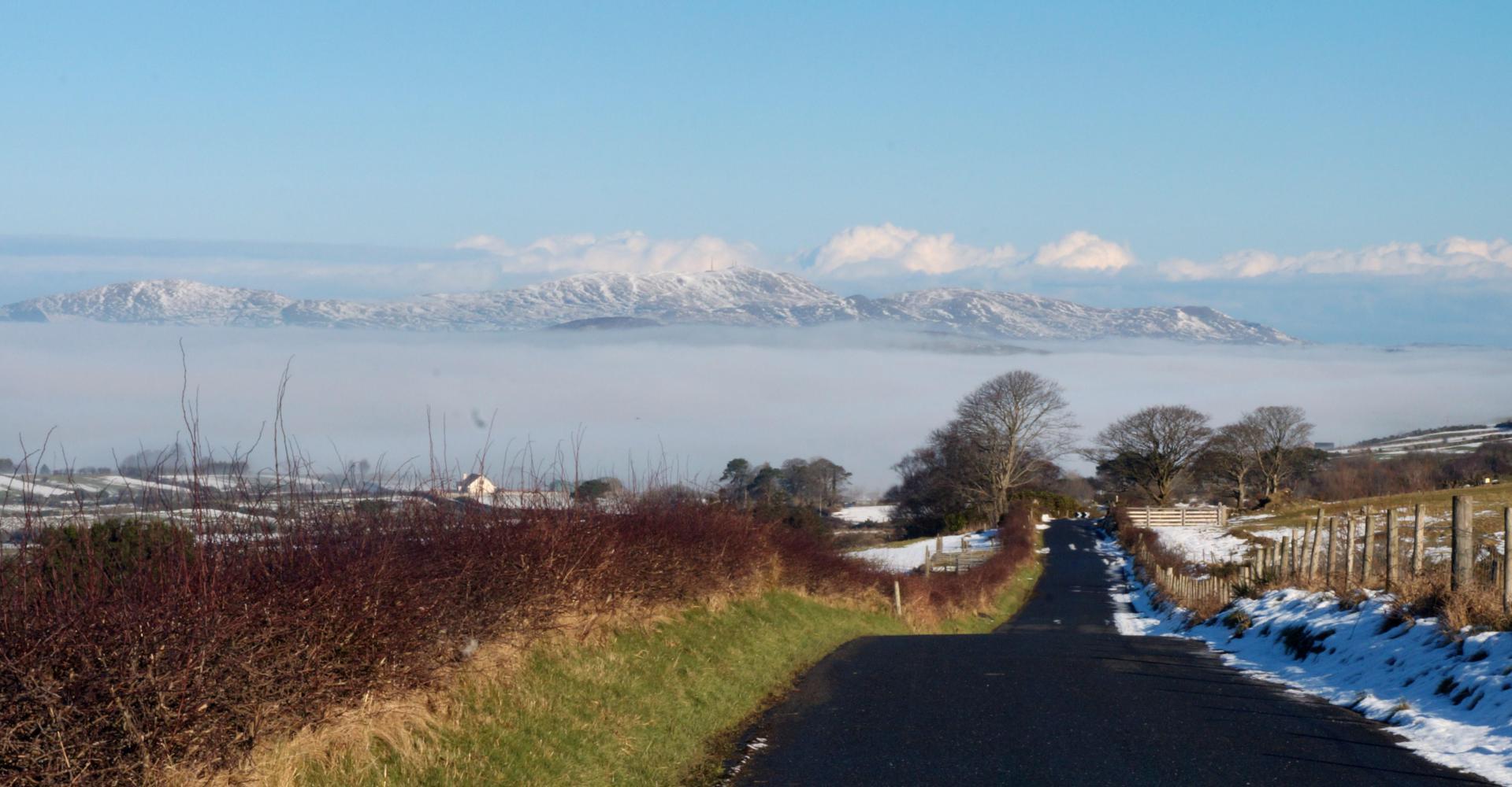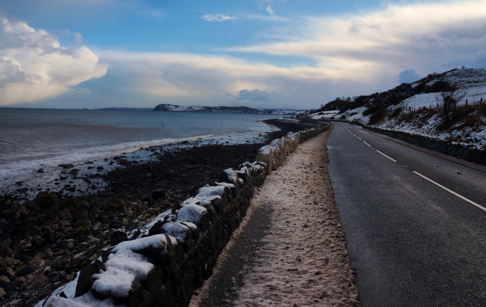 I reach the big Carryduff roundabout six-thirtyish as the snow eases, where the A-road splits in two, alternatively veering left and my road straight on. From here on the traffic is reduced to a trickle. The road has a shoulder so I carve through fresh snow, while cars hiss by in dirty wet snow.