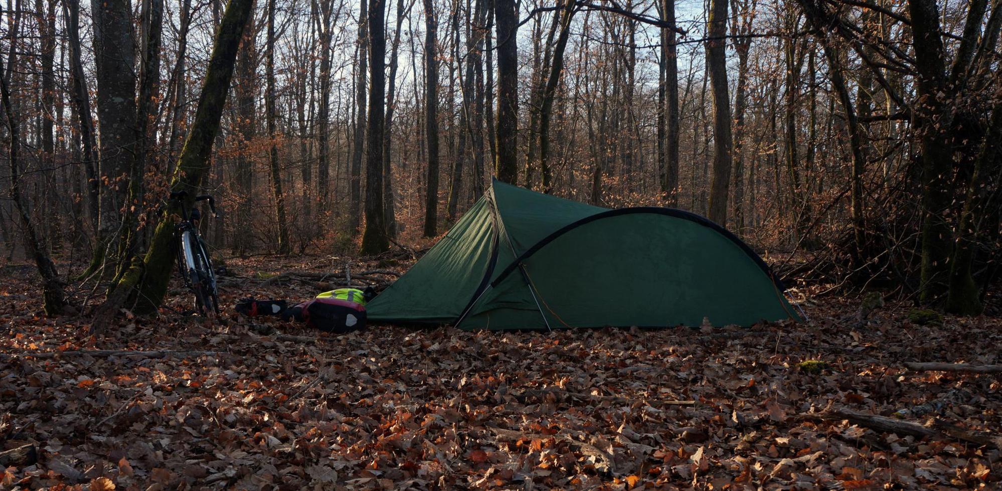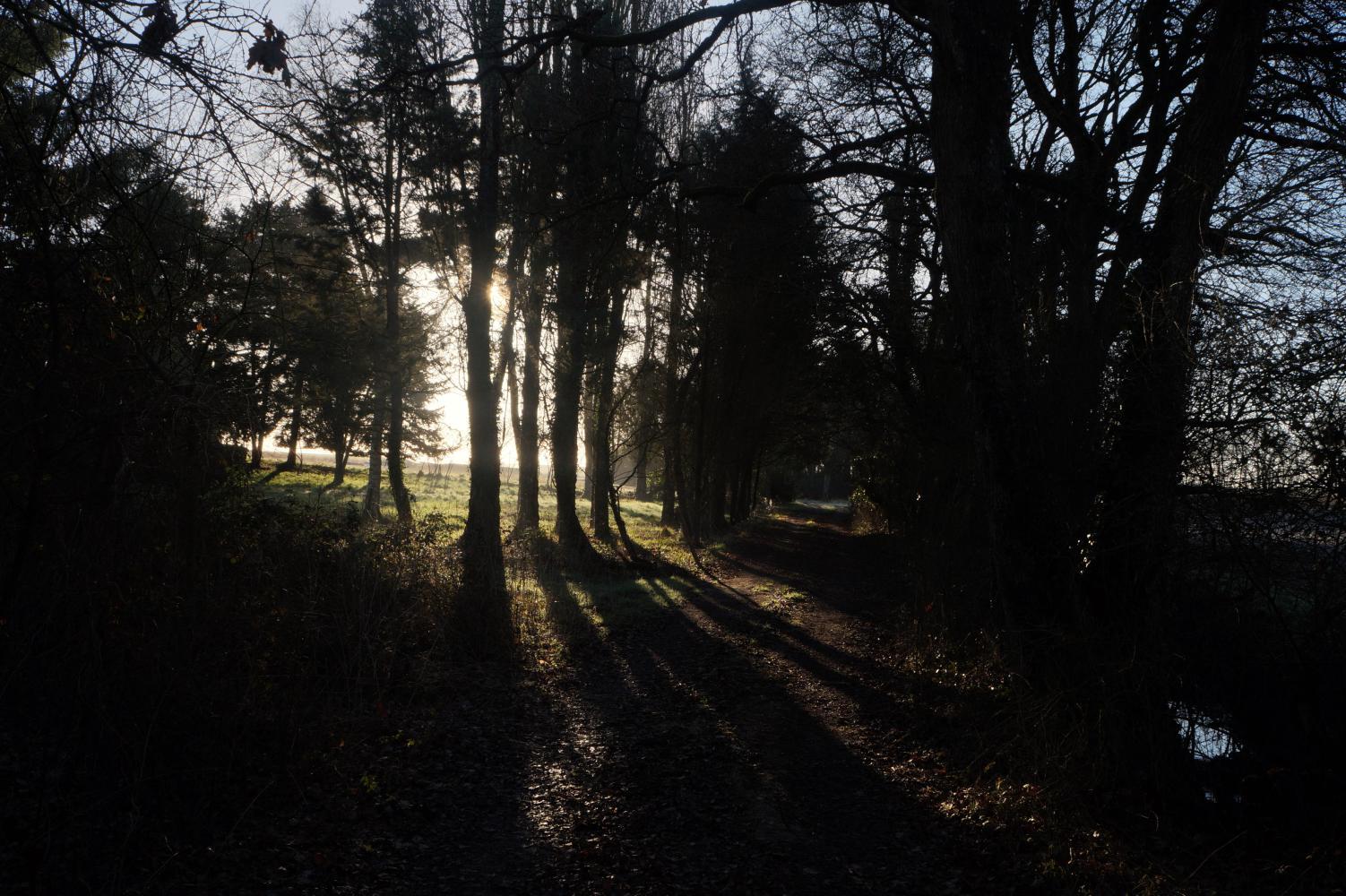 The moonlight breaking in beams of light through the trees makes it a difficult night getting to sleep. And when I do sleep it's sleep disturbed by ghoulish calls in the woods and I've the sensation of some animal biting at my foot. Waking with dawn I'm in time to see the orange line of the sun breaking along the crest of the sloping wheat field the other side of the road. The tent is bone dry and there's no hint of frost. The sun now well up is warming. But later the farm track up to the road is frozen, greatly easing the ride, especially the boggy area chewed up by tractor wheels where I'd to push the bike round on the way in yesterday evening, I can ride straight across. And on the road I can see white frost in places like the shaded woodland edge of fields