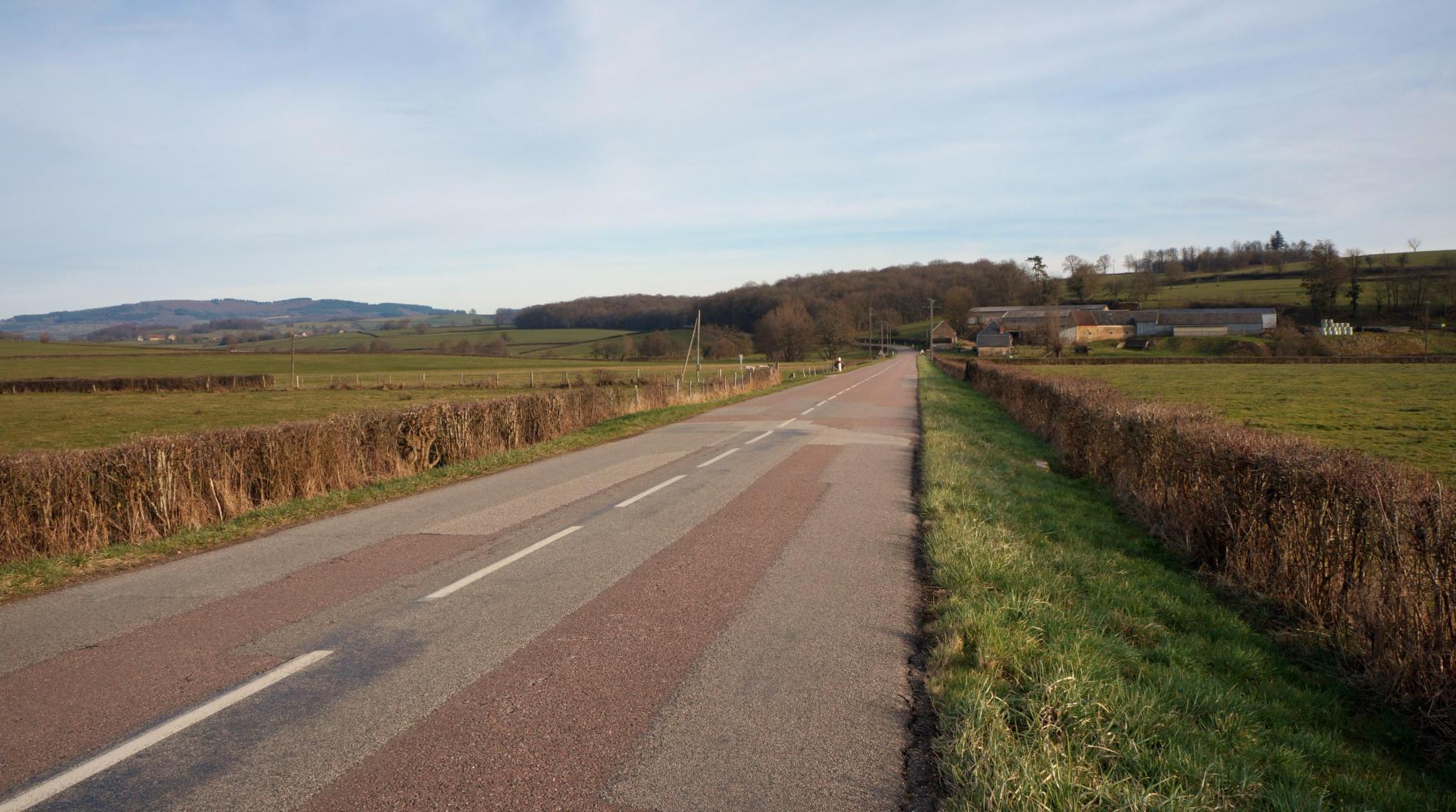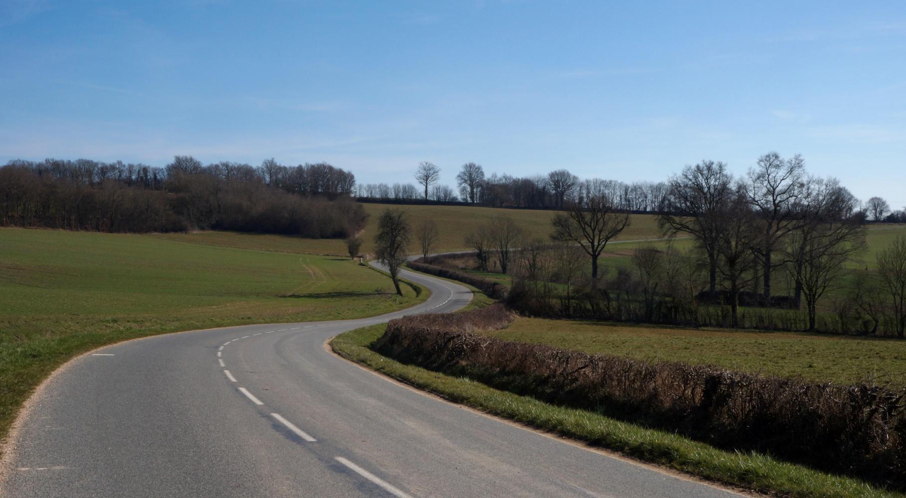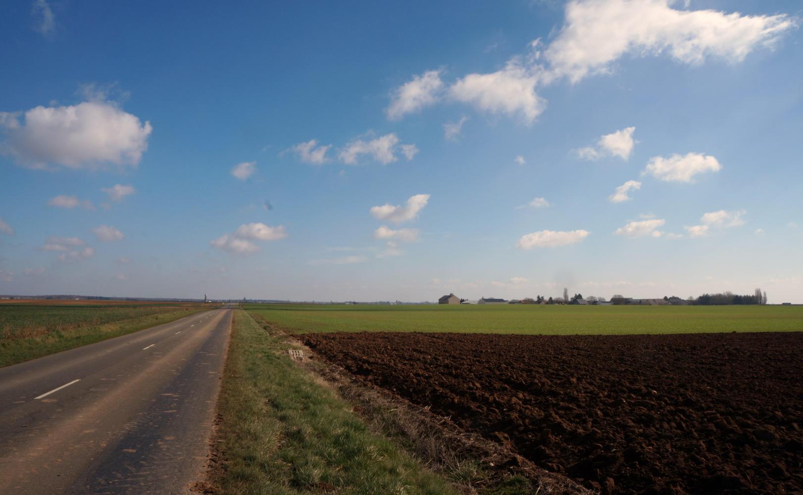 It really feels like Spring this morning. There's the tweeter of birdsong and I see a yellow breasted finch flutter in and out over the road from the rapeseed. The farmland is open to the road and field divisions are groves of woodland. Further on it becomes boundless without even woodland, just a treeless plain with an odd ripple of undulation and a distant water tower or church spire. There are a few freshly ploughed squares, but most is autumn drilled up and growing vivid green.